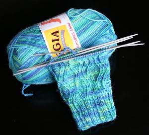 I like to have a simple stocking stitch sock on the needles and I keep it beside my computer. When I’m reading blogs or email or waiting for pages to load I pick it up and knit a few more stitches.