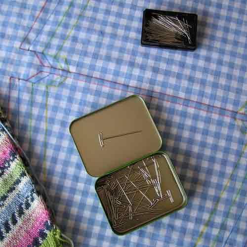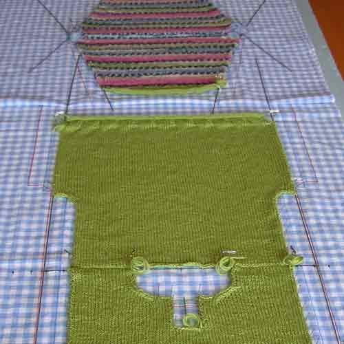 This is the best part – for my standard patterns I’ve drawn up a cheat sheet in all my pattern sizes on a piece of gingham using fabric markers. All I have to do is place the sweater pieces over their pattern piece on my blocking cloth and pin to fit the measurements. I love it and it saves me so much time.