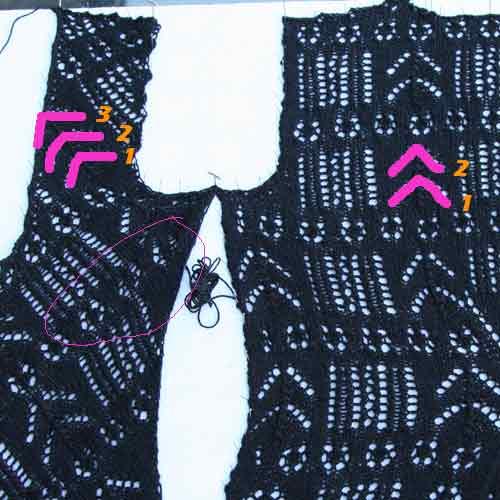 - Then when working on the reverse shaping for the other front, I noticed that I did three repeats of the horseshoe lace pattern instead of two at the top (see photo). This too could probably be okay, but all these problems together are really bothering me. (That coupled with having already ripped and reknit a number of times and I don’t want to ‘waste’ any more time with fixes that may or may not work. This was supposed to be a quick knit, not a huge distraction.)