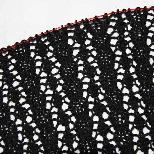 I’m stalled on the black lacey cardigan. I started it hoping to be able to wear it to a wedding on September 1st (I’m always cold at receptions). I guess I was feeling a little overconfident and thought I could finish it even though I’m working on a number of other projects. I wasn’t counting on the vague instructions for managing the ever increasing lace repeats over the bias knit fronts.