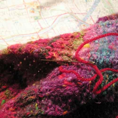 While visiting at Marje’s house, we planned our attack on the yarn shops the next day. I worked on finishing up Eloise because I wanted to wear her on the weekend. I didn’t sew up the seams with the knitting yarn because it was too bulky and uneven – I just didn’t want that headache and felt that the seams would not appreciate it either. Instead I used a fingering weight yarn in a red that basically went with the many colours in Blossom. I could have used any colour really because the yarn just disappears into the seam, never to be seen again (you can click to enlarge the photo). Isn’t mattress stitch wonderful!