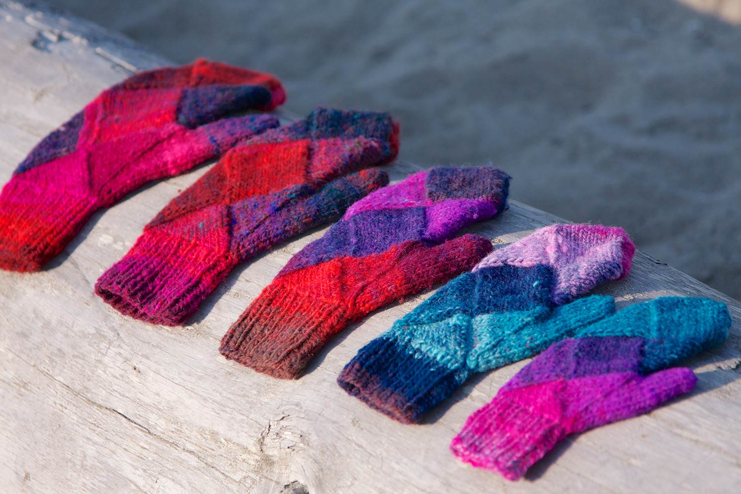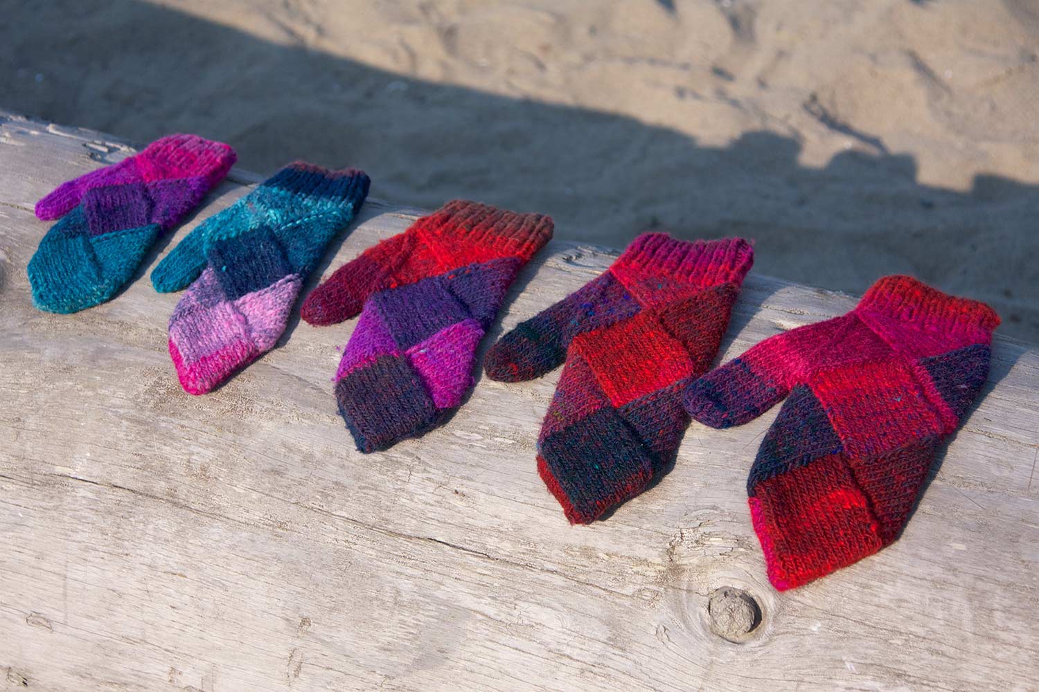 The workshop project is a mitten in the smallest size which fits a 2 to 4-yr-old and a pair takes only one ball of Noro Kureyon. You may use any other worsted weight yarn, but Kureyon is so fun to work with because of the lovely colours.