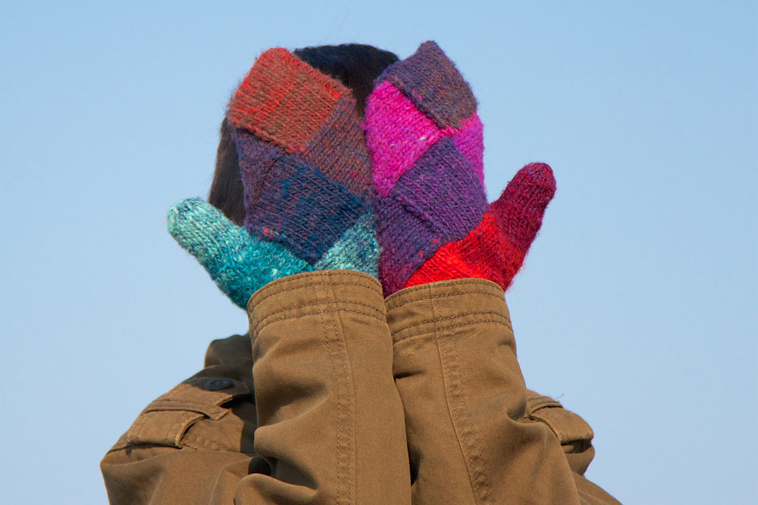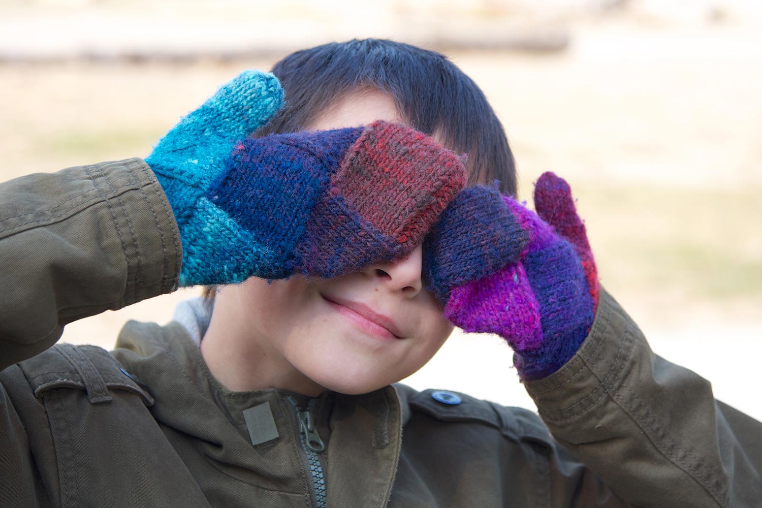 I’ve rewritten my Entrelac Mittens pattern in five sizes—enough for the whole family. The design is featured in Knit Noro: Accessories. After I found out that the publishers decided to offer it in just one size I wanted to test out my sizing theory. First I sized the mitten up, then down, down and down again. Hana is modeling her mittens which are one size smaller than the ones in the book.