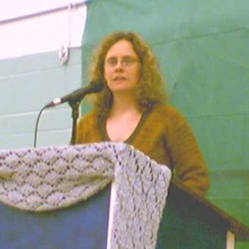 Yes, that’s who you think she is! Stephanie Pearl-McPhee a.k.a. the Yarn Harlot was standing directly in front of me while waiting for her introduction at her talk Saturday evening in Victoria. (Sorry for the grainy cell phone photo – must remember my bloggerly duties and bring my camera to these events.)