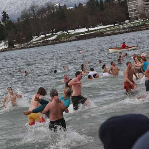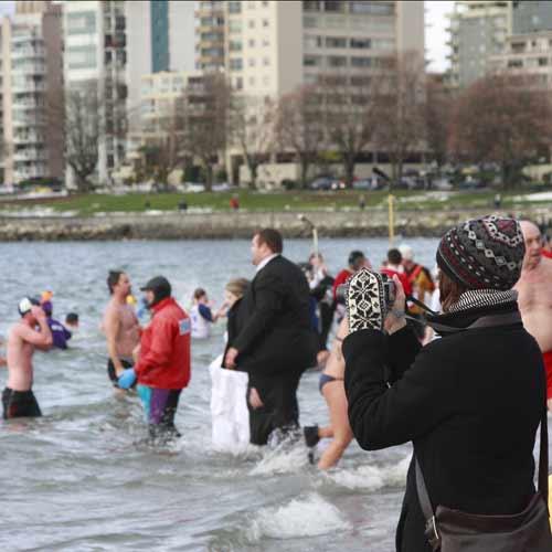 The 89th annual Polar Bear Swim was yesterday and it was our first time observing the 1550+ brave (or perhaps crazy?) souls who bared their skin to take a dip in the frigid 6 degree C (43 F) water at English Bay. Air temp was 2 degrees (35 F), snow was still on the ground (unusual for Vancouver) and all the people who weren’t swimming were bundled up appropriately.