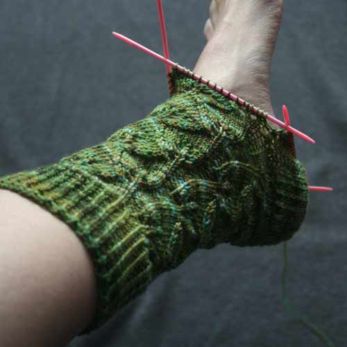 After knitting half the sock, I’m not so sure it is the perfect project for this yarn. There’s too much competition between the hand-painting and the lace pattern. When I stand up and look down at my feet on the floor, the stitch pattern is barely discernible. This is how I test a stitch pattern with a self-patterning or hand-painted yarn. If the stitch pattern doesn’t add an element of interest to the project from a distance of at least five feet, then it’s a wasted effort. I think I’ll have to sit on this for a while.