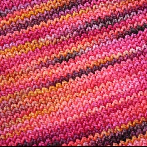 Yarn: Koigu KPM red (2120) and Koigu KPPPM pinks/reds/oranges (P62 – I think, the writing’s hard to read), 2 skeins each
