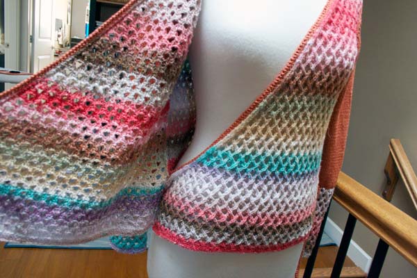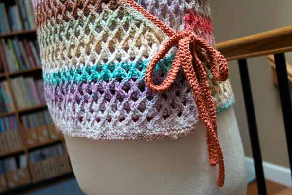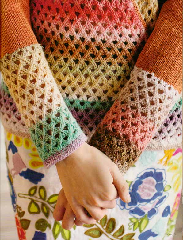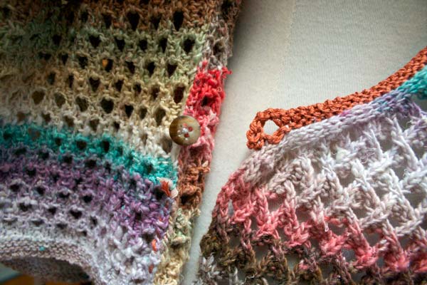 So beautiful in Noro Taiyo Sock, I had fun planning the striping so it wouldn’t match up—not as easy as that sounds! The openwork lattice pattern is on the fronts, back and deep sleeve cuffs.