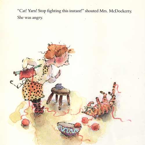 Throughout the story, this chant repeats itself with more and more mischief inserted between the lines. The animals get all tangled up in the yarn and Mrs. McDockerty keeps trying to move her knitting out of their reach. Finally young Jack comes home and has the simplest solution of them all. He politely asks the animals to leave.