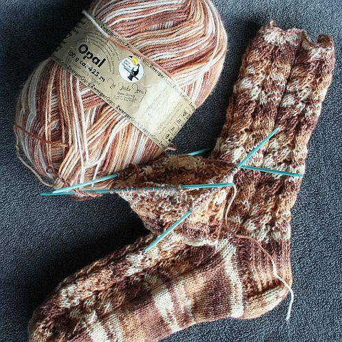 While trolling the internet and pouring over my stitch dictionaries looking for both appropriate and inappropriate stitch patterns for use with self-patterning sock yarn, I came across Megan Humphrey’s sock pattern called Eagle’s Flight using Opal’s Owl colourway. In the online photos the feathery lace stitch looked promising. It didn’t seem to disappear into the Owl colourway.