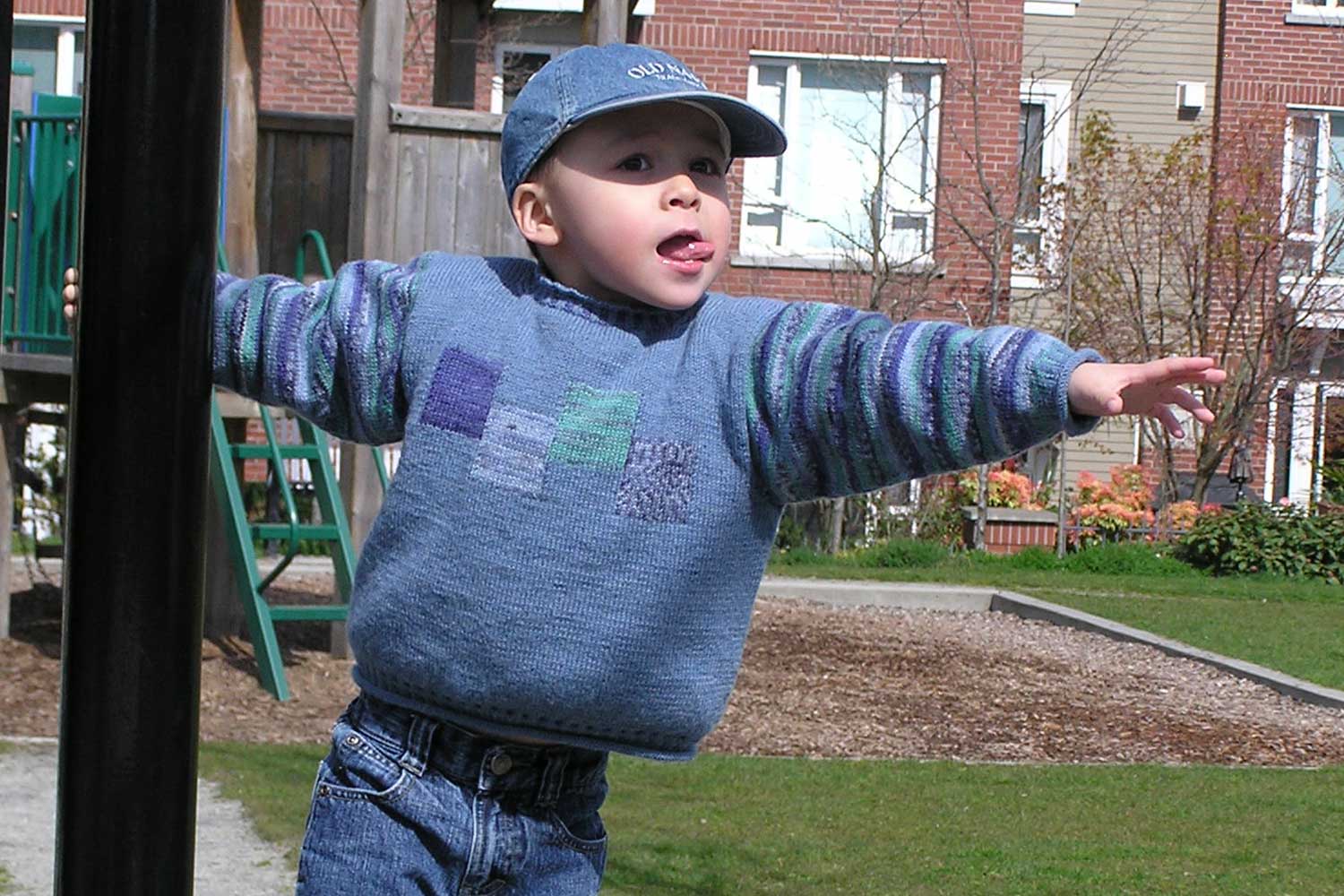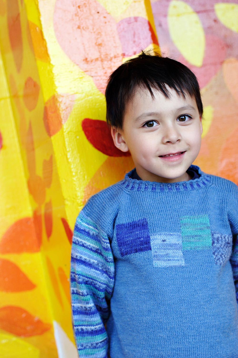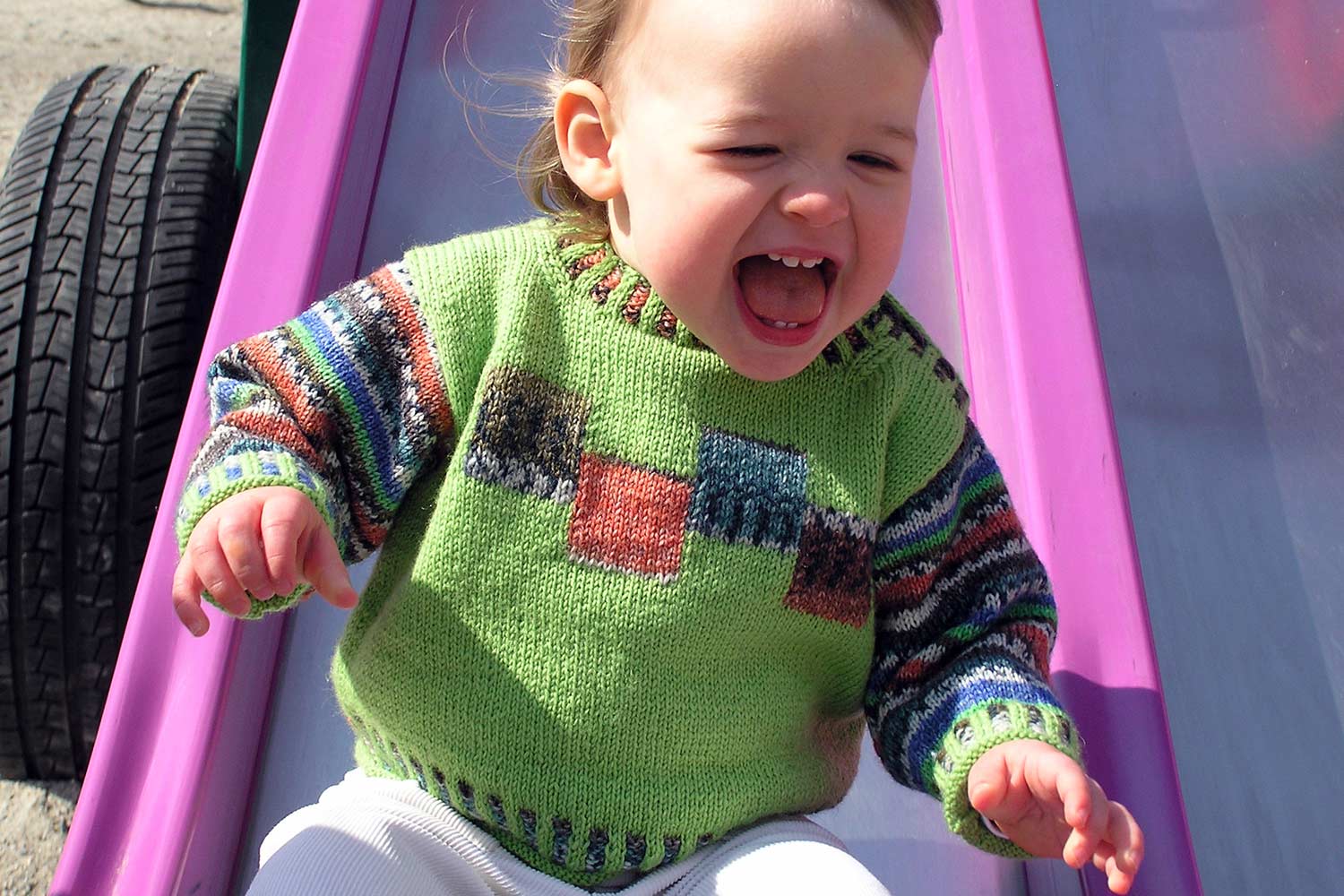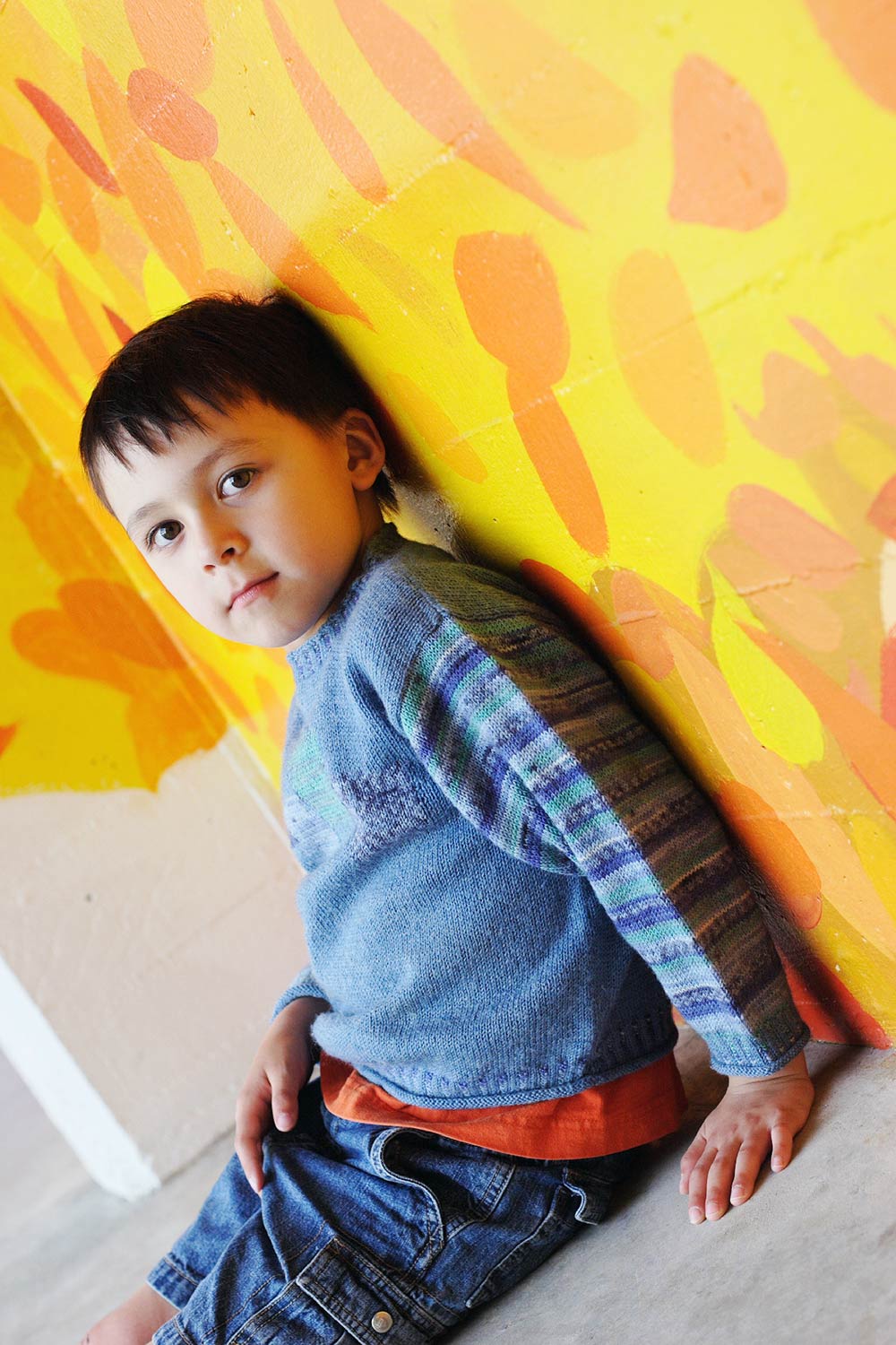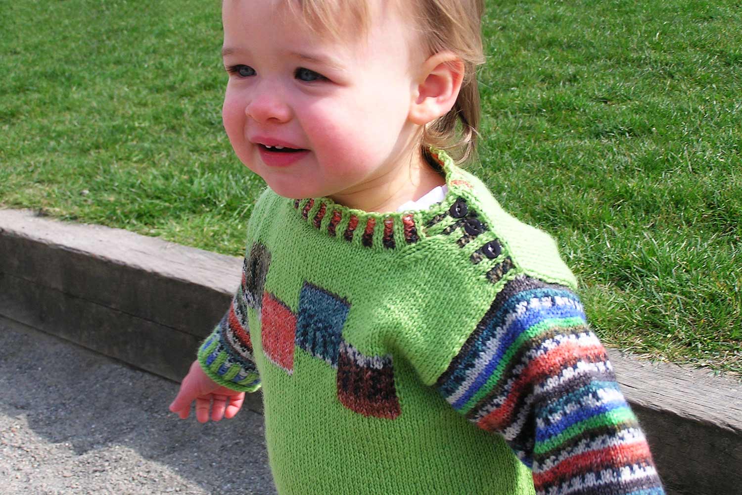 This playful pullover for babies and little kids has blocks of colour on the front that coordinate with the Fair Isle-like patterned sleeves. Corrugated ribbing ties it all together and self-patterning sock yarn simplifies the colourwork.