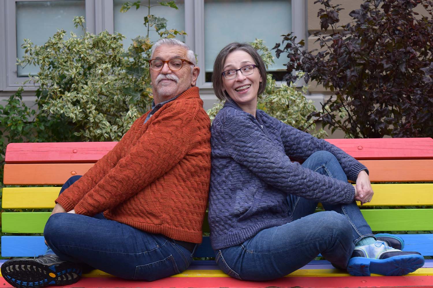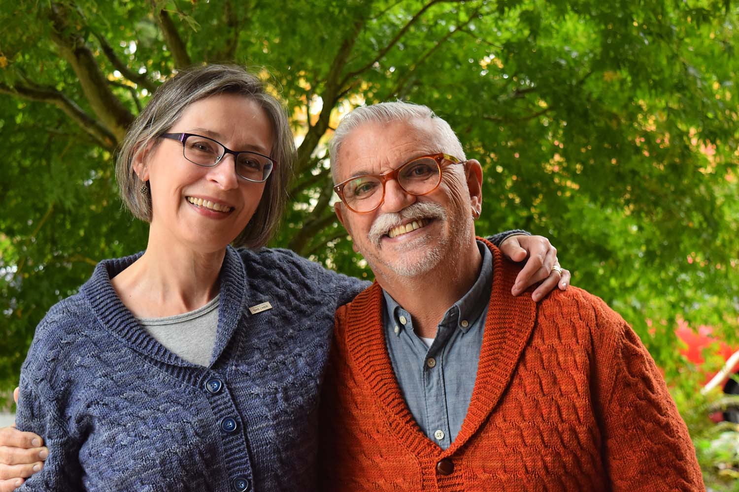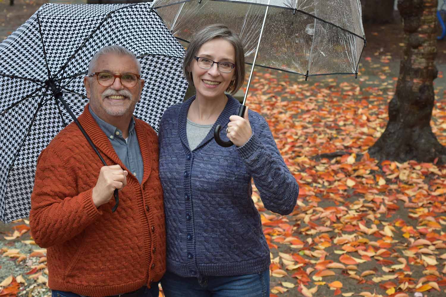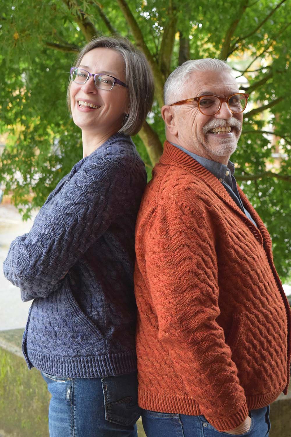 Shown in SweetGeorgia Yarns Superwash DK (100% superwash merino wool; 256 yd/234 m per 4 oz/115 g skein); Cayenne (seen on Nigel) or Stealth Mode (seen on Holli), 9 (9, 10, 10, 11)(11, 12, 13, 14)(15, 16, 17, 18, 20) skeins to 9 (9, 10, 11, 11)(12, 13, 14, 15)(16, 17, 18, 19, 21) skeins.