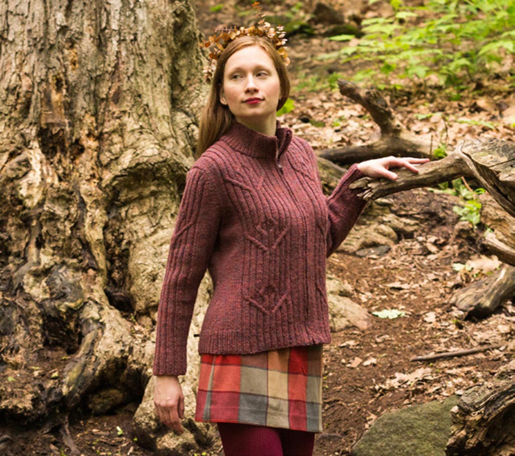 Shown in Briggs & Little Heritage (100% Pure Wool; 215 yd / 196 m per 4 oz / 113 g skein) in #76 Red Heather, 6 (6, 7, 8, 8, 9, 10, 10, 11) skeins.