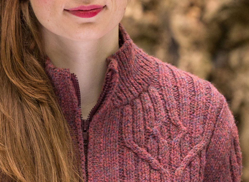 This cardigan is worked in pieces from the bottom up, then sewn together after blocking. The front armholes are worked to a longer depth than the back for an English-tailored shoulder. The front bands are worked in two pieces, a front and a back facing; the zipper is sewn in place between the bands. The cable pattern is presented in both chart form and row-by-row instructions.
