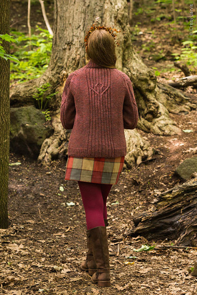 Stitch magic. Boreas is a unisex cardigan—almost a jacket—with plantlike cables, growing organically from the ribbing as a backdrop. It’s a versatile sweater that can be dressed up or down.