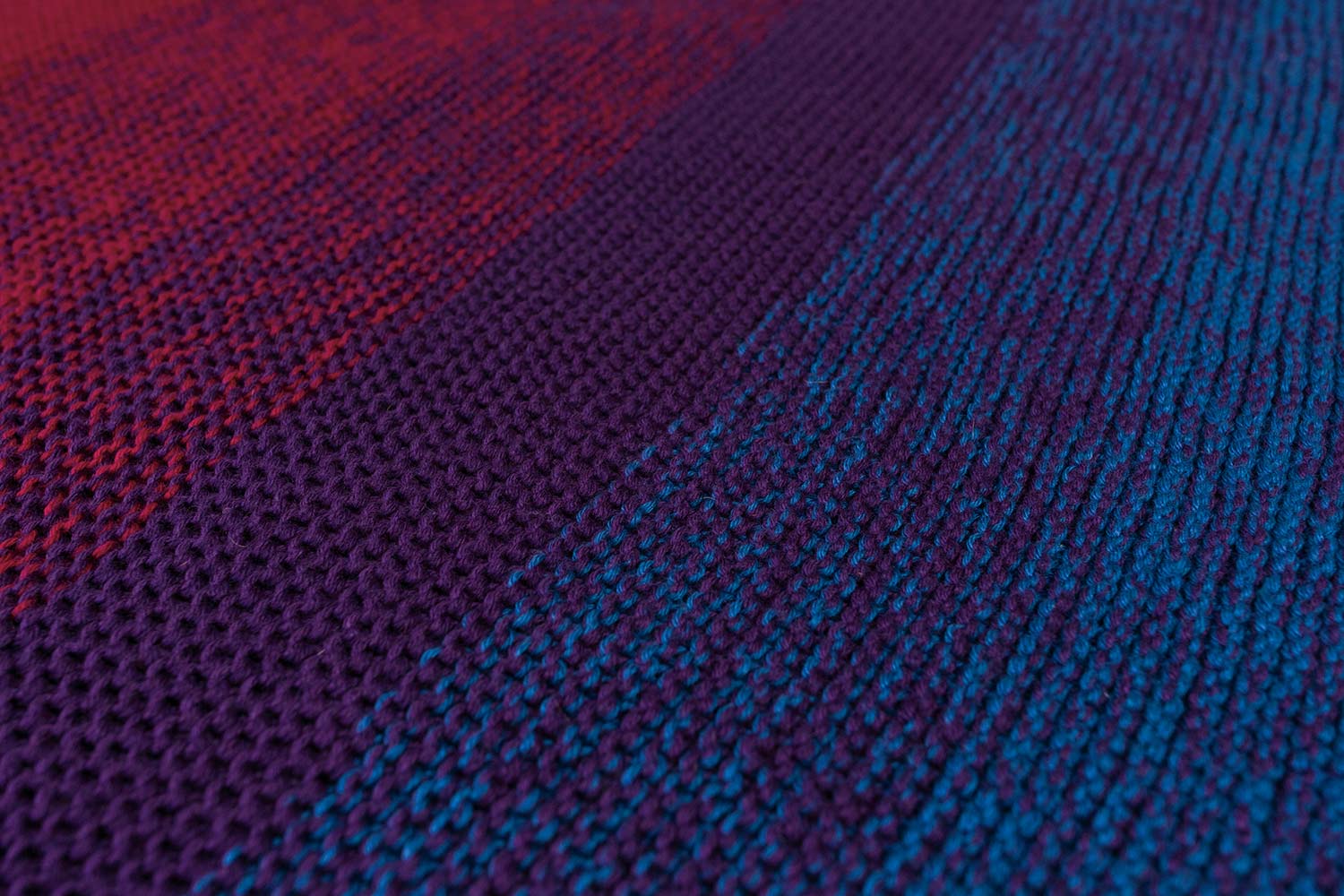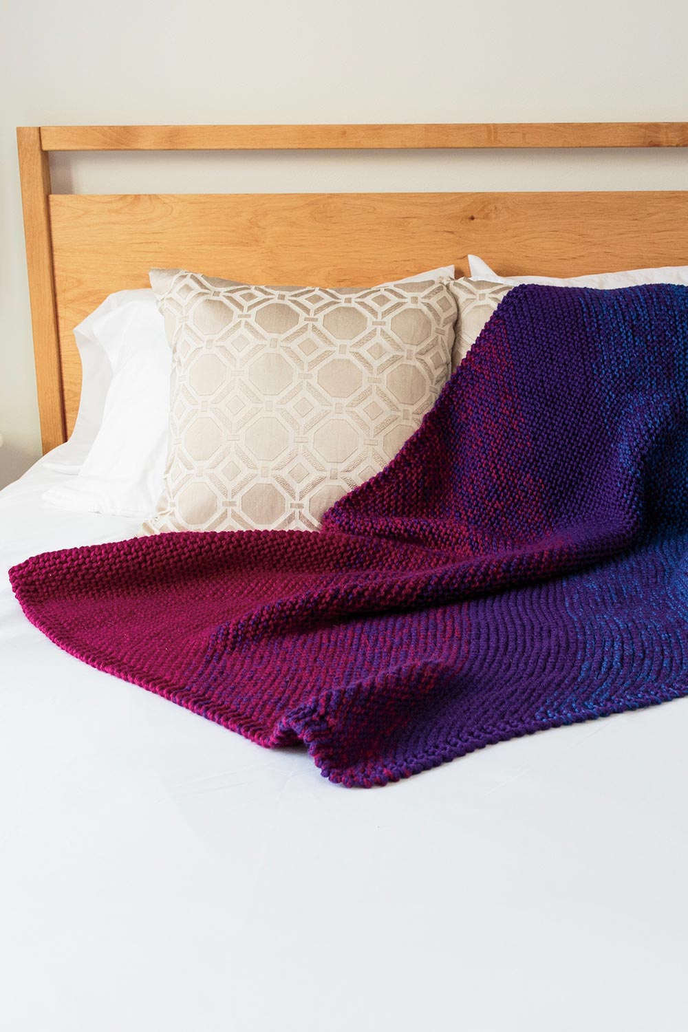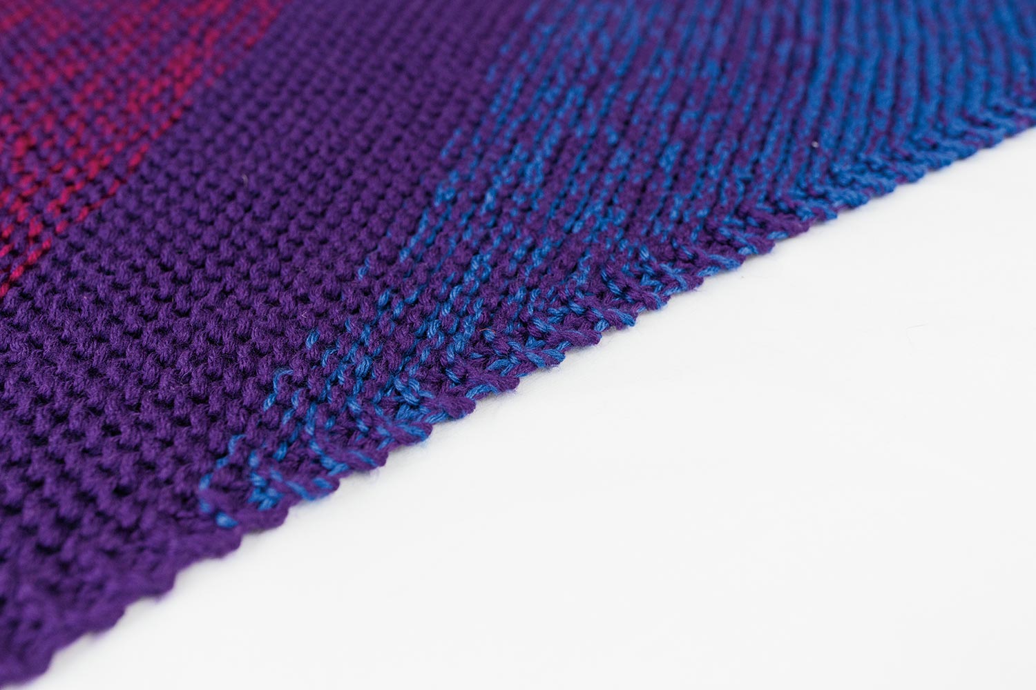 Holding three strands together, switch out one at a time to generate the smooth continuous colour shift from corner to corner. The blanket is worked in Garter Stitch on the bias. Three strands of yarn are held together throughout. This pattern has no charts.