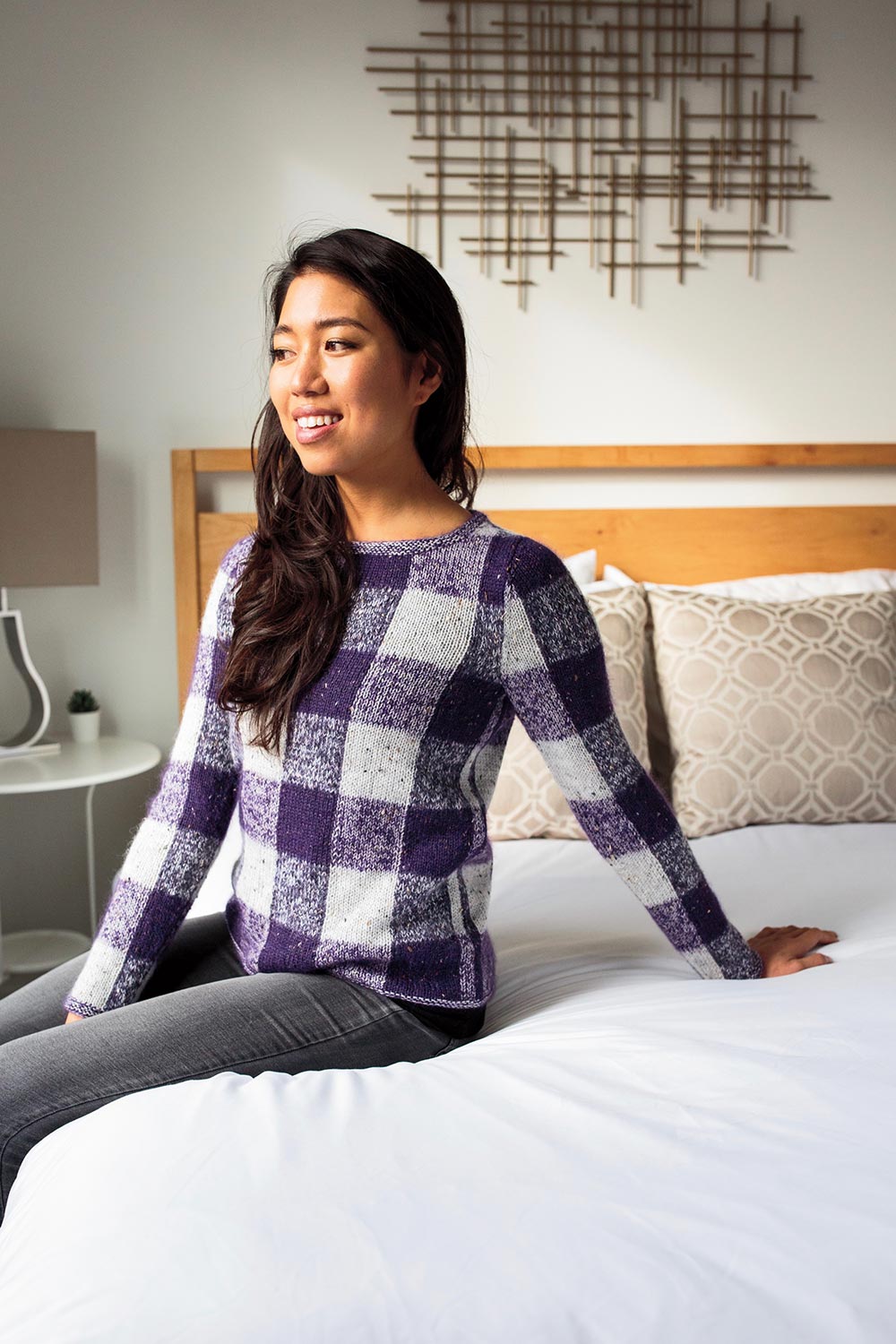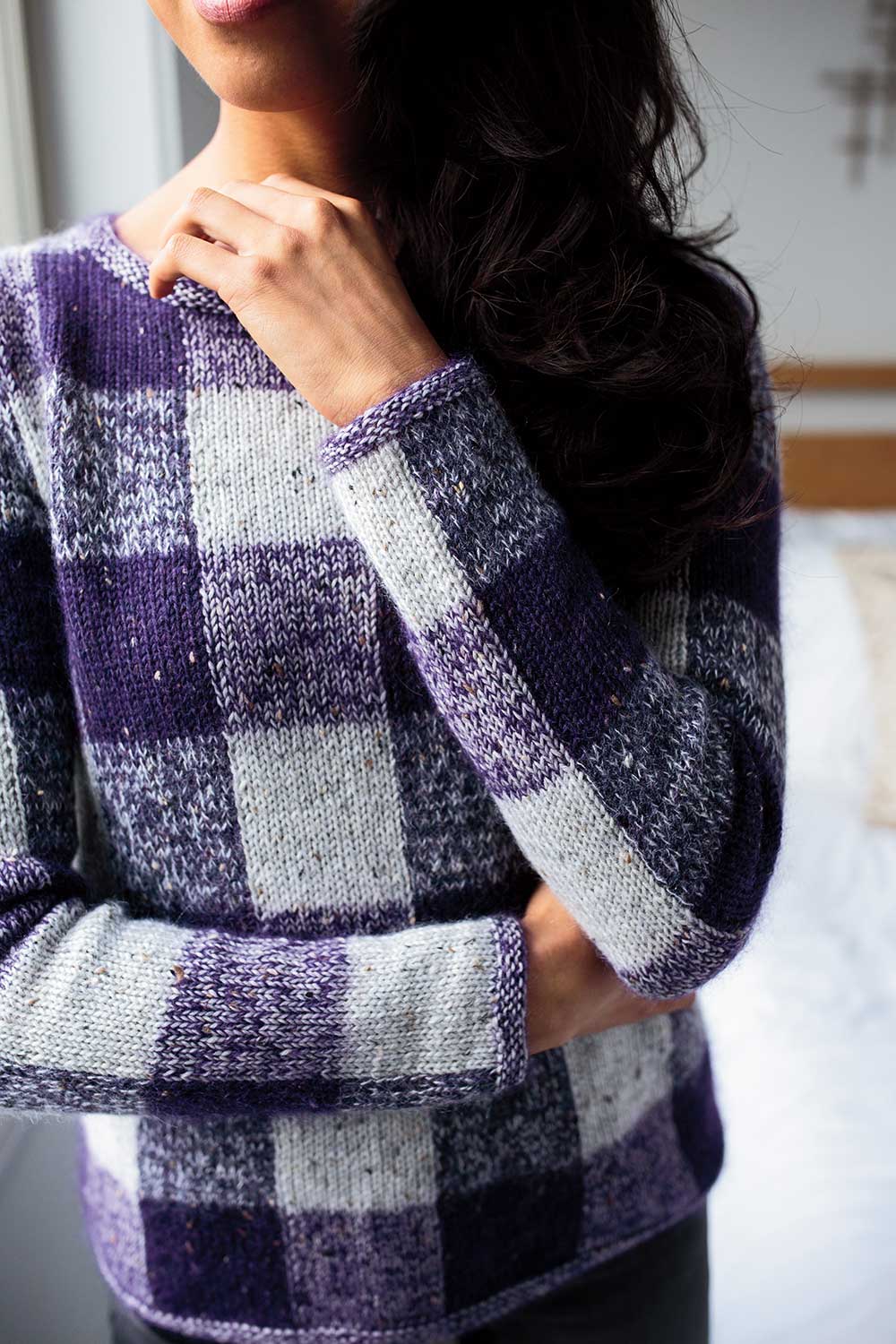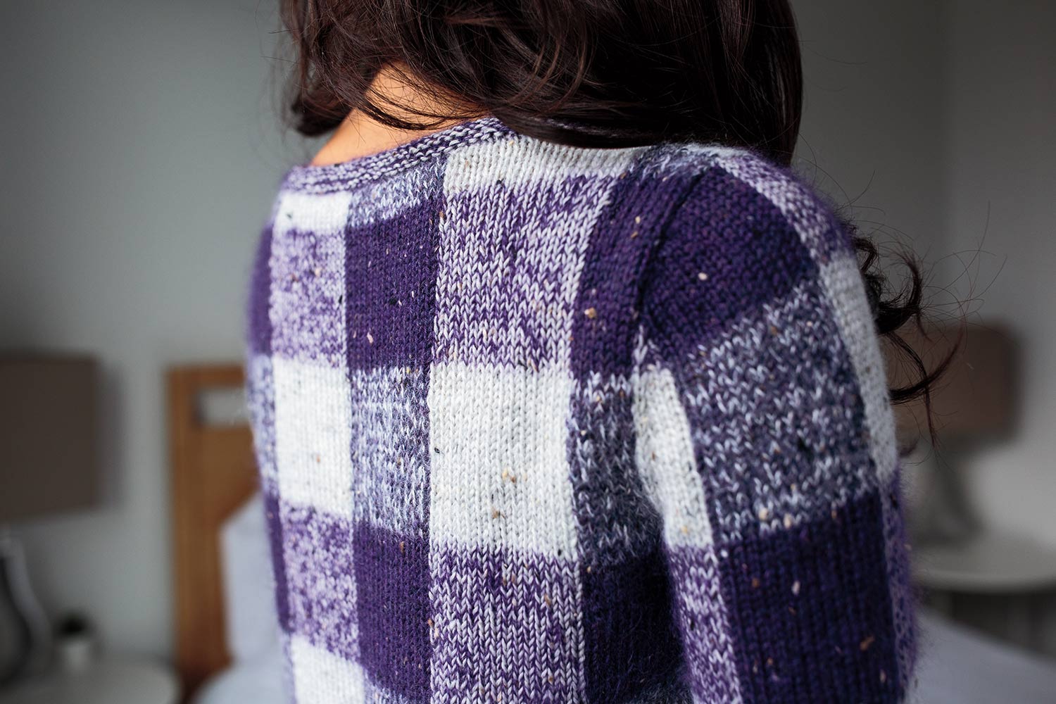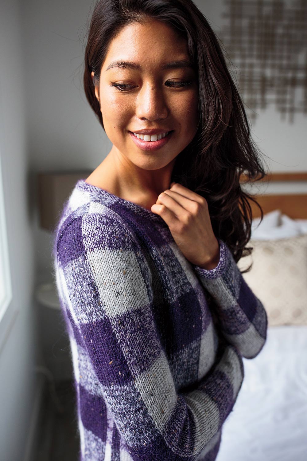 The bold checkered fabric in this statement pullover comes from a double blend—not only are weaving and knitting techniques combined, it’s holding two yarns together that creates the colour effect. A fingering weight tweed yarn is worked in wide intarsia vertical stripes, while at the same time a strand of mohair is worked in horizontal stripes which lends coziness as well as clever colour variation.