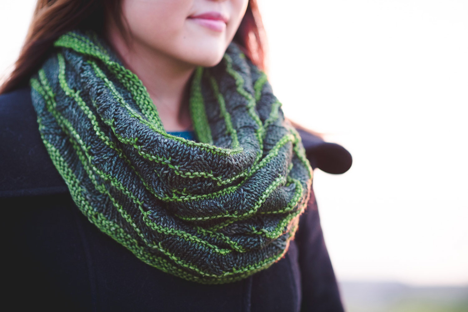 This cozy cowl comes in two depths and is designed to maximize the yardage of the main colourway. The shallow cowl looks great around the neck, but it can also be pulled down around the shoulders. The deep cowl is long enough to really bunch up and provide warmth on frigid winter days. They both can also be pulled up and worn like a hood. Both versions have two simple lace patterns and are worked in the round.