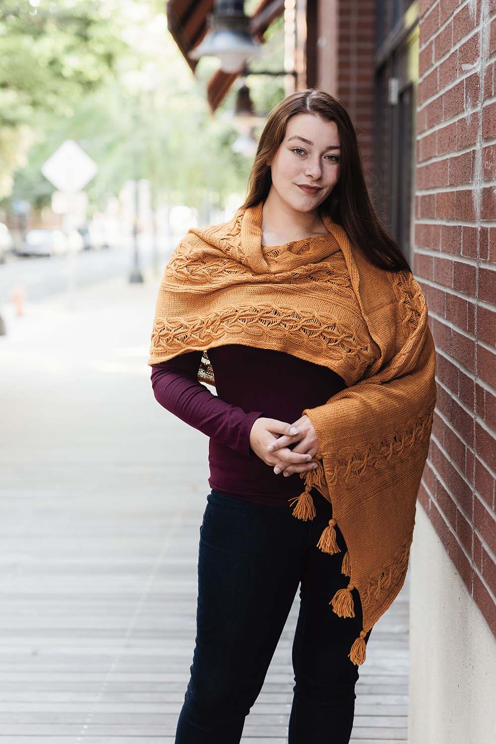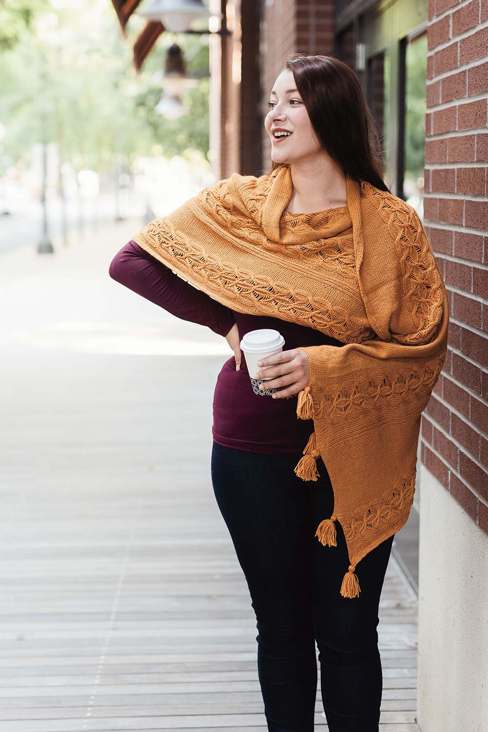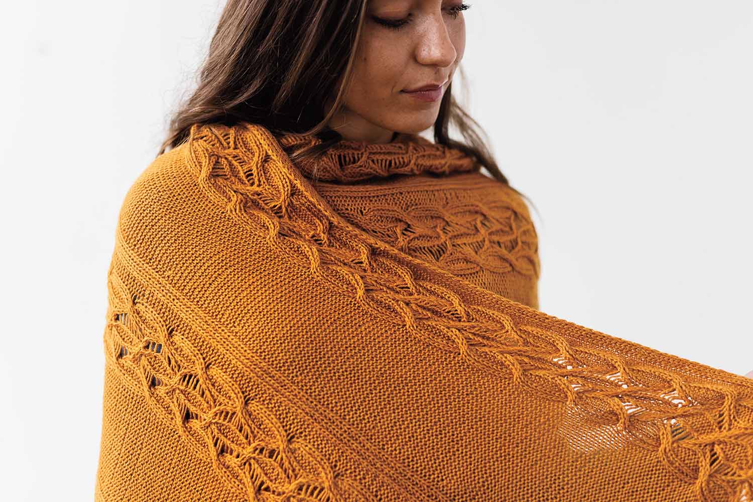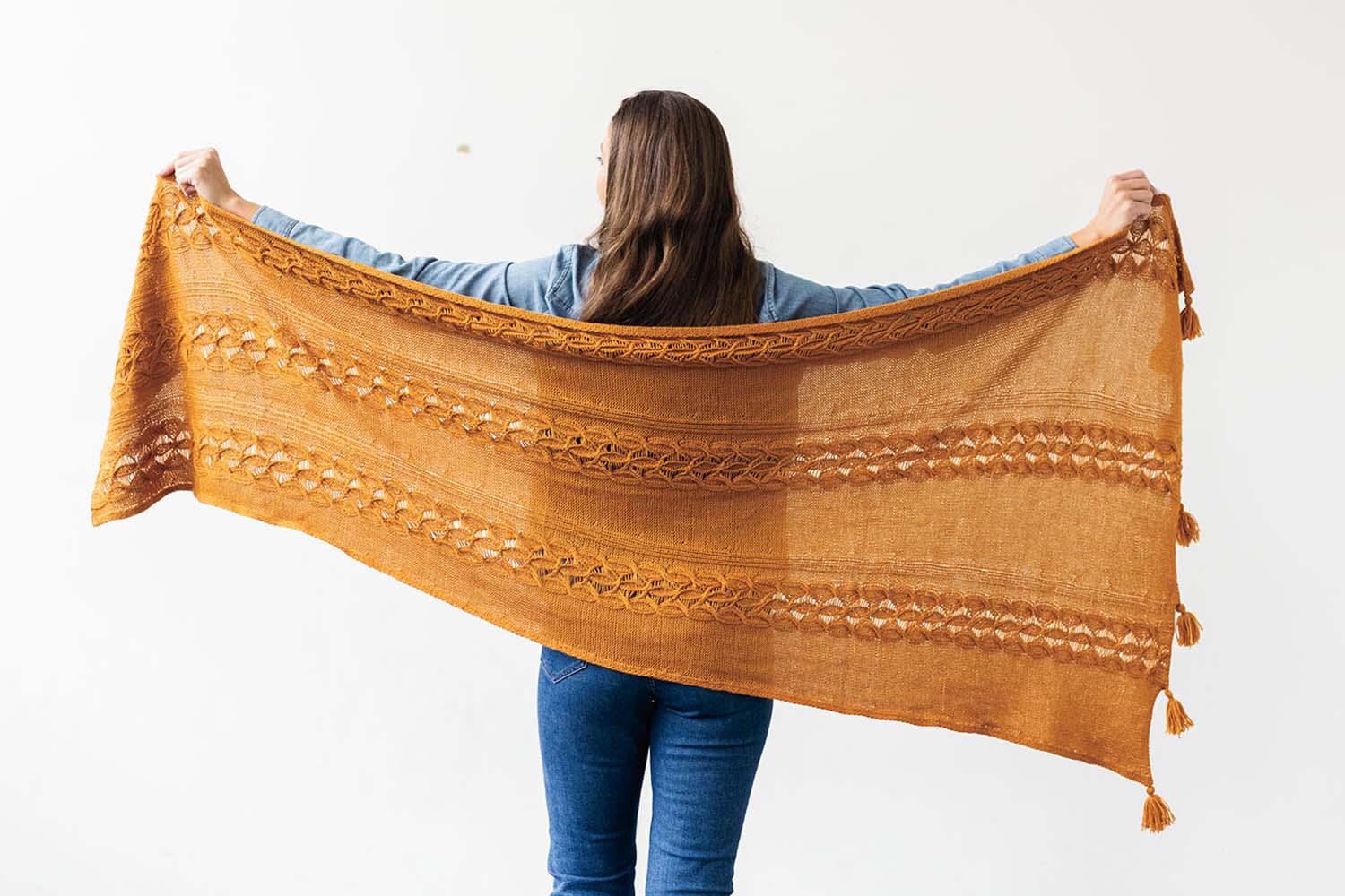 Old Norwegian Cast On (instructions included), raised increases, yarnovers, working cables from chart or written instructions, dropped stitches, slipped stitch selvedge, Stretchy Bind Off (instructions included), tassels.