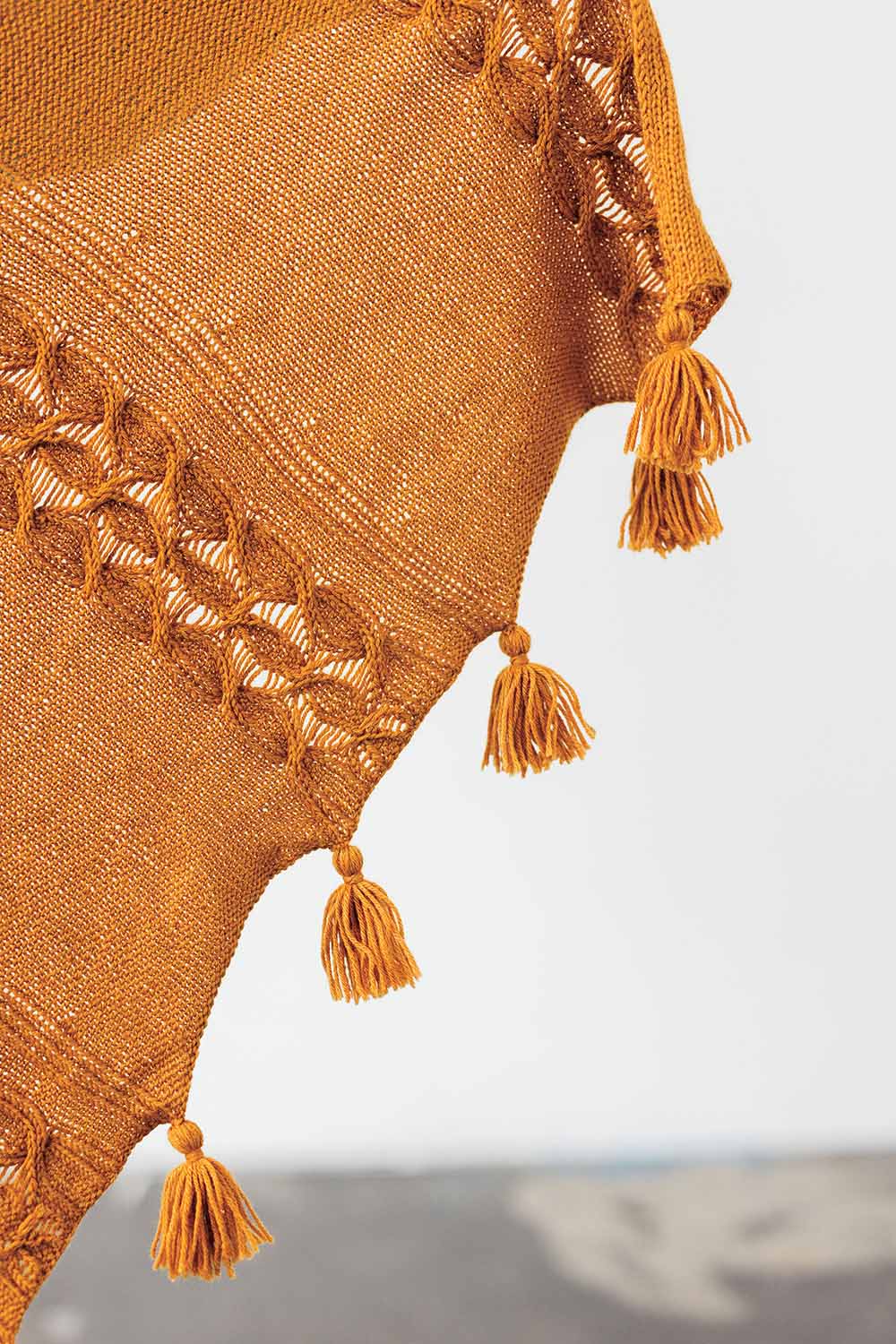 With a background of dropped stitches, these cables seem to catch each other in mid-air like a great trapeze act. The asymmetric trapezoid shape adds even more to the impression of swinging energy, finished with tassels for a little razzle-dazzle.