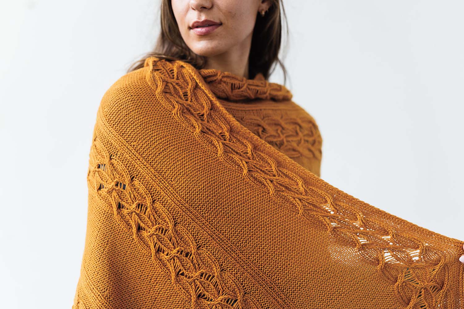 Choose the right level of drama: the pattern offers three shawl sizes and one scarf size, all worked from the narrow to the wide end, with panel(s) of drop-stitch cables on a ground of Reverse Stockinette Stitch divided by ribbing. Simple stretchy cast-on and bind-off edges allow the option of blocking the shawl with either scalloped or straight ends.