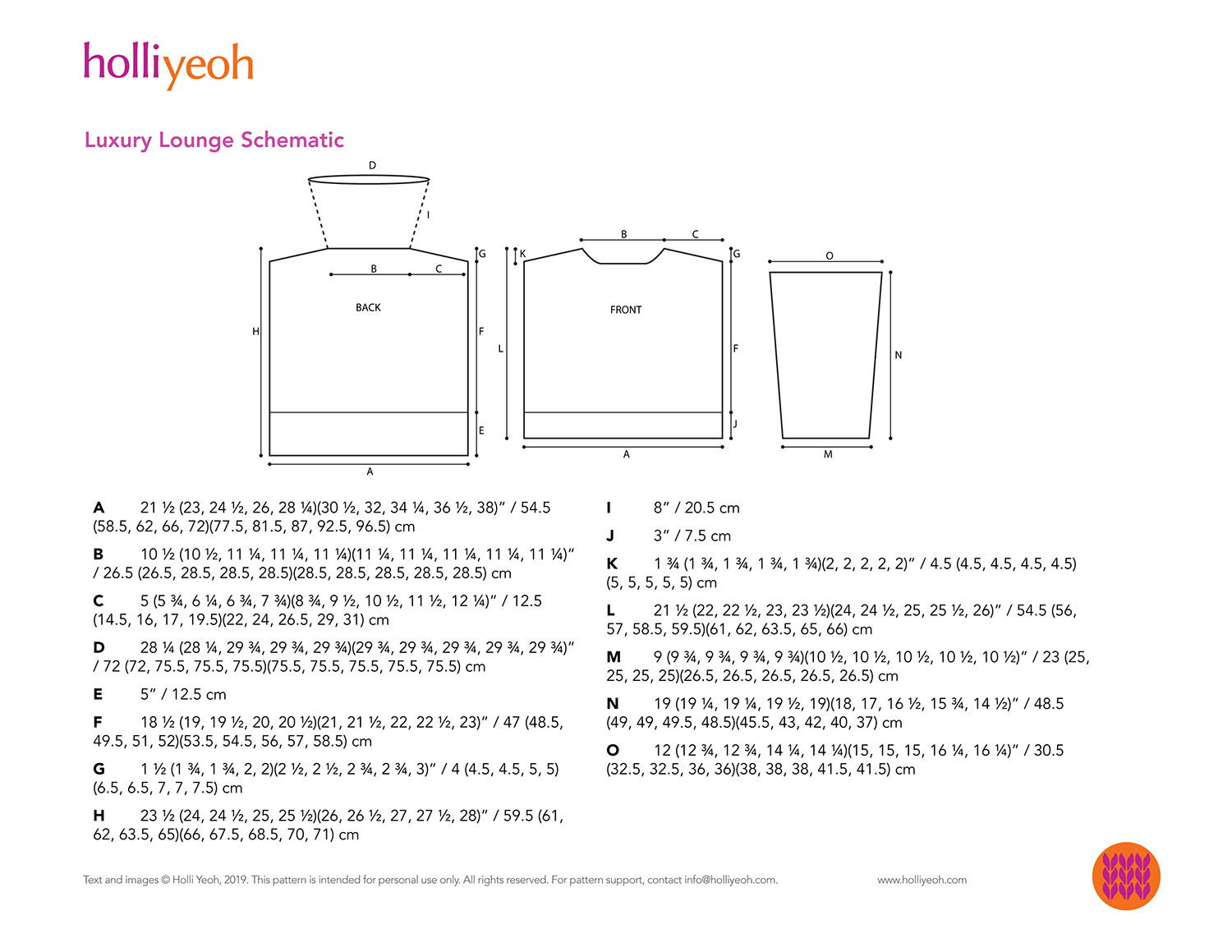 Finished chest circumference: 41 ¾ (44 ¾, 47 ¾, 50 ½, 55)(59 ½, 62 ½, 67, 71 ½, 74 ½)” / 106 (113.5, 121.5, 128.5, 139.5)(151, 159, 170, 181.5, 189) cm.