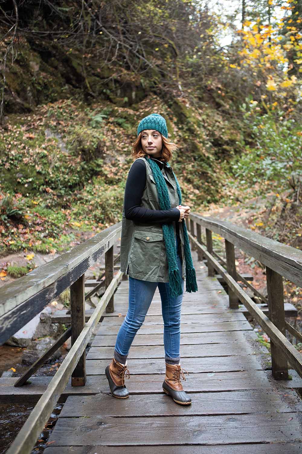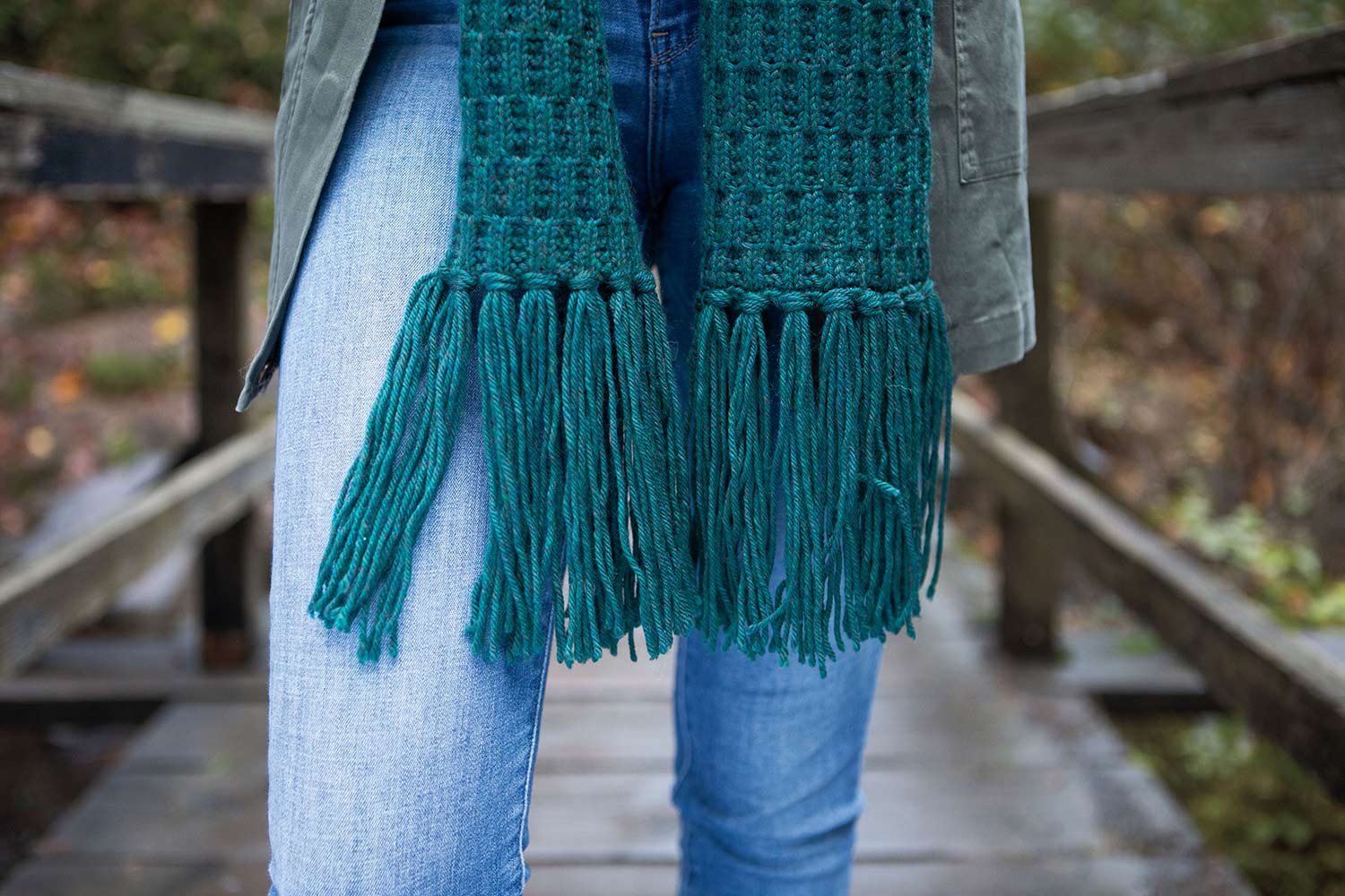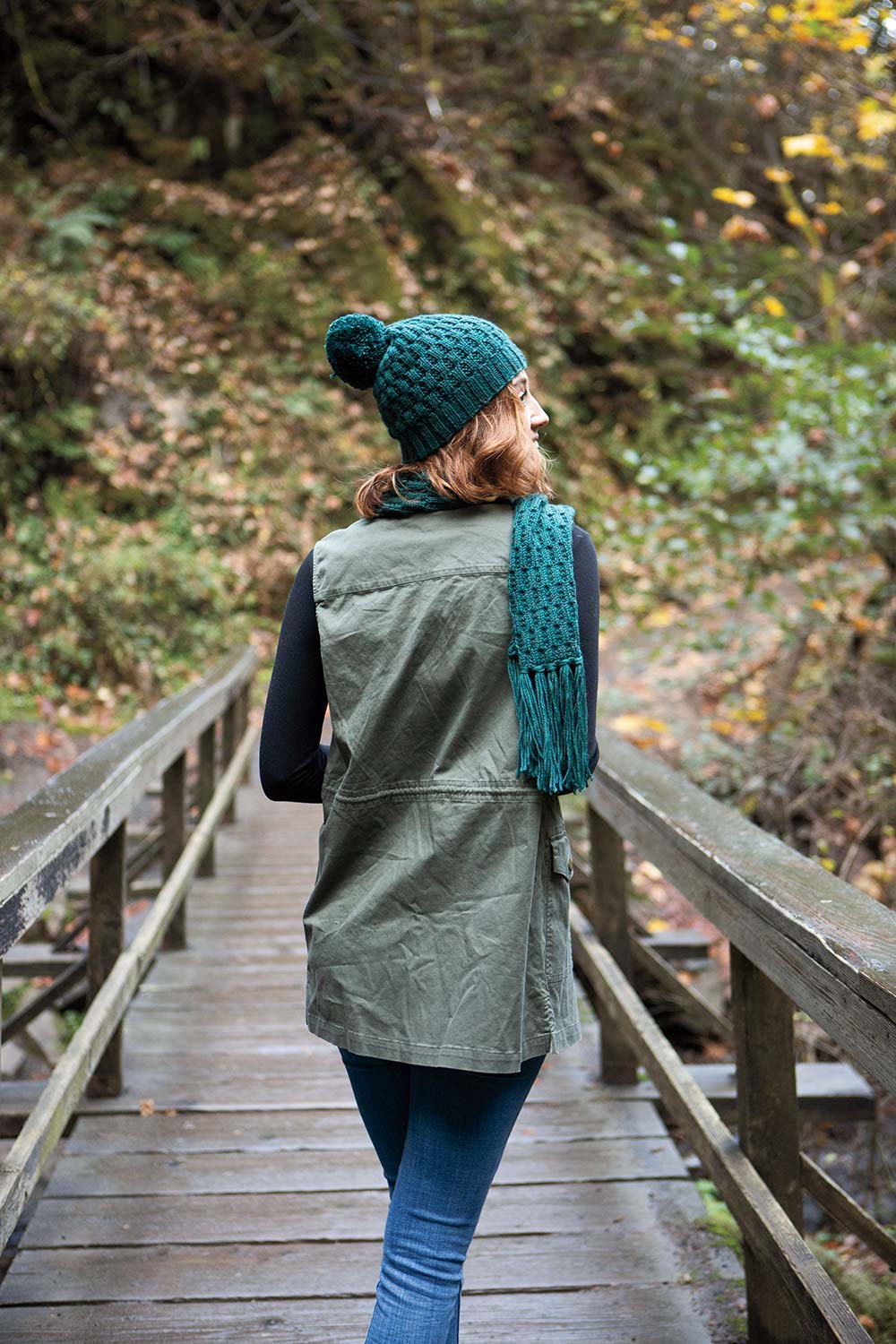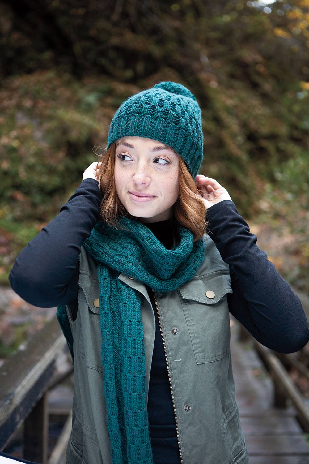 Undulating ribbing flows over a field of garter stitch, with twisted stitches adding depth and texture as well as knitting interest. The fabric lies flat naturally, making a neat all-over scarf pattern and a cozy air-trapping hat. A cheery fringe and just the right amount of slouch make these the wearable winter accessories you’ll reach for every day.