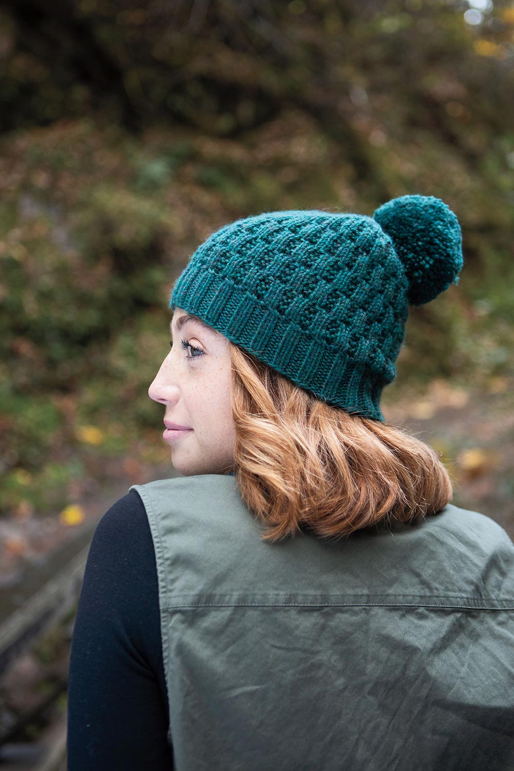 The original yarn is a DK weight superwash wool that works up at 5.5 sts per inch (2.5 cm) on 3.75 mm (US 5) needles. Choose a similar weight yarn in a fibre that’s comfortable to wear. Animal fibre blends will provide the best warmth. A smooth, solid-coloured yarn will show off the stitch pattern to best advantage.
