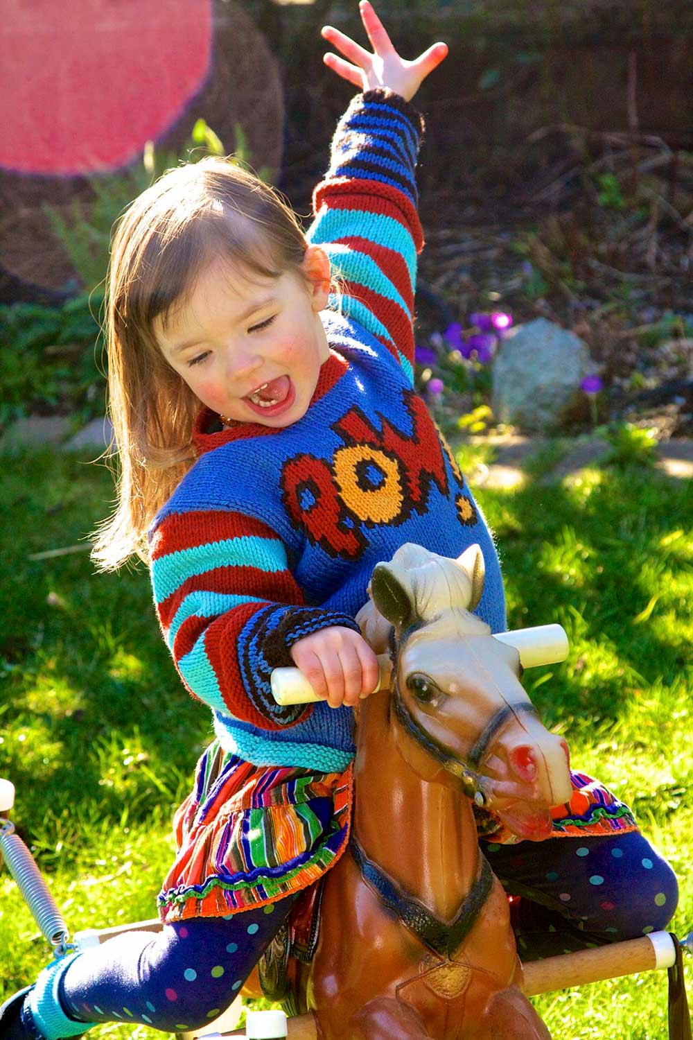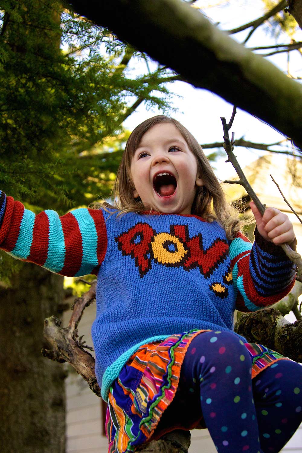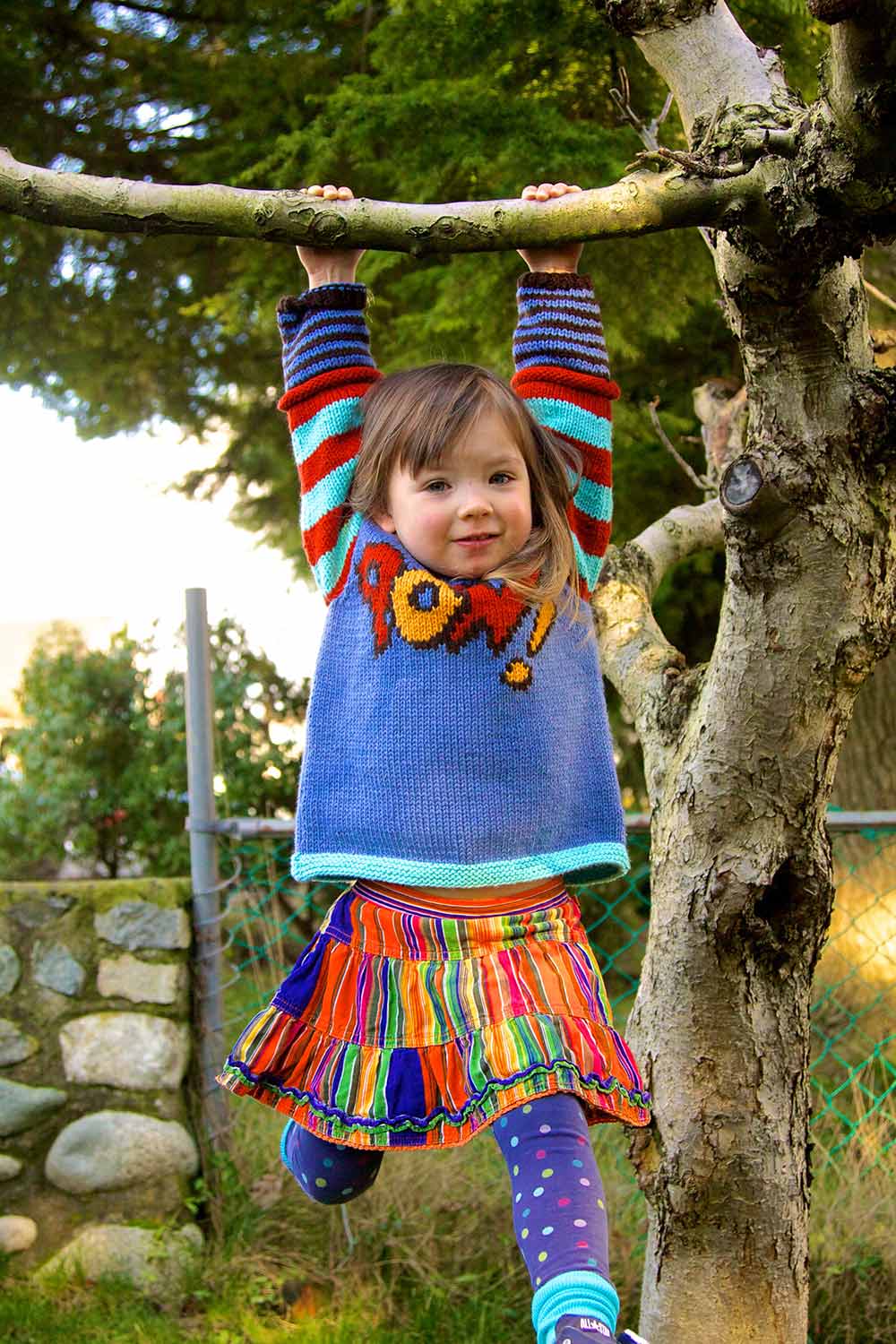 I’ve always loved the word onomatopoeia, especially that it’s such a long word to describe the often one-syllable words that suggest sounds in our written language. Pop! Bam! Pow! I think there’s a similarity between onomatopoeia and intarsia colourwork—it takes more work but packs a great visual punch.