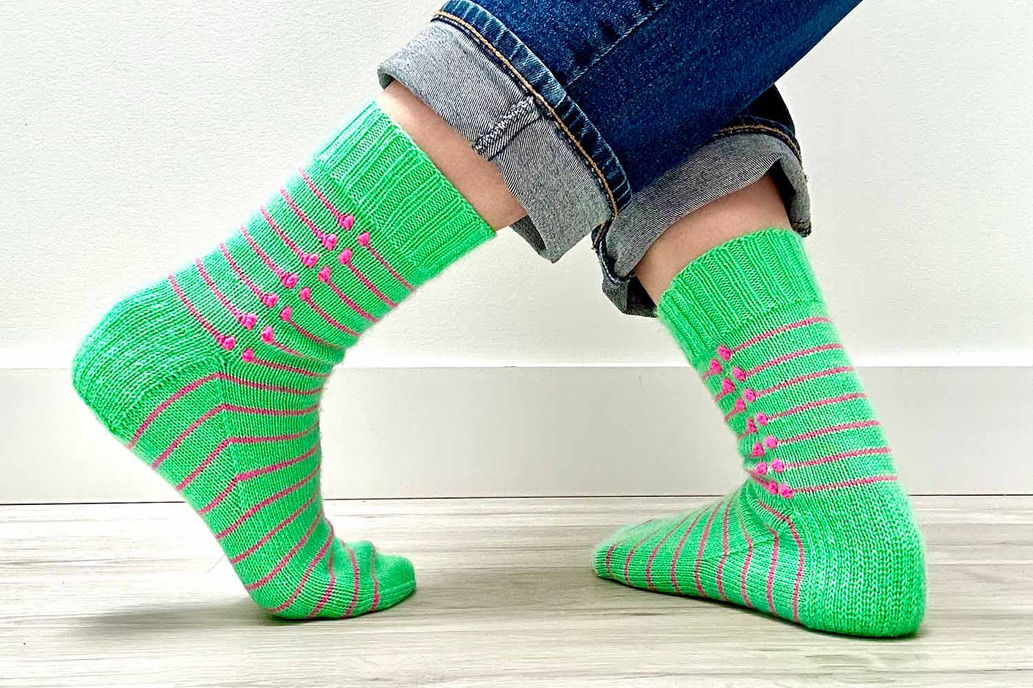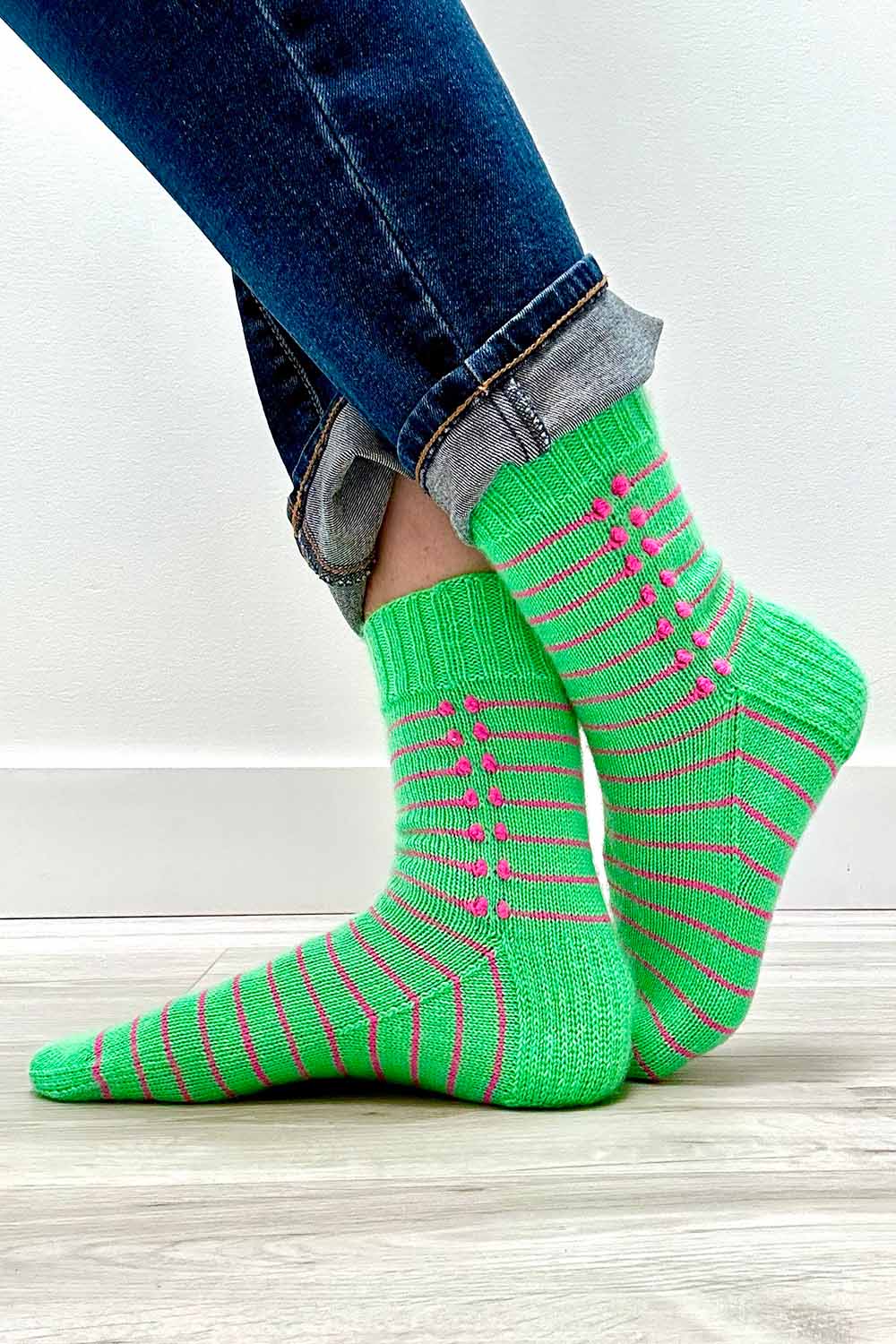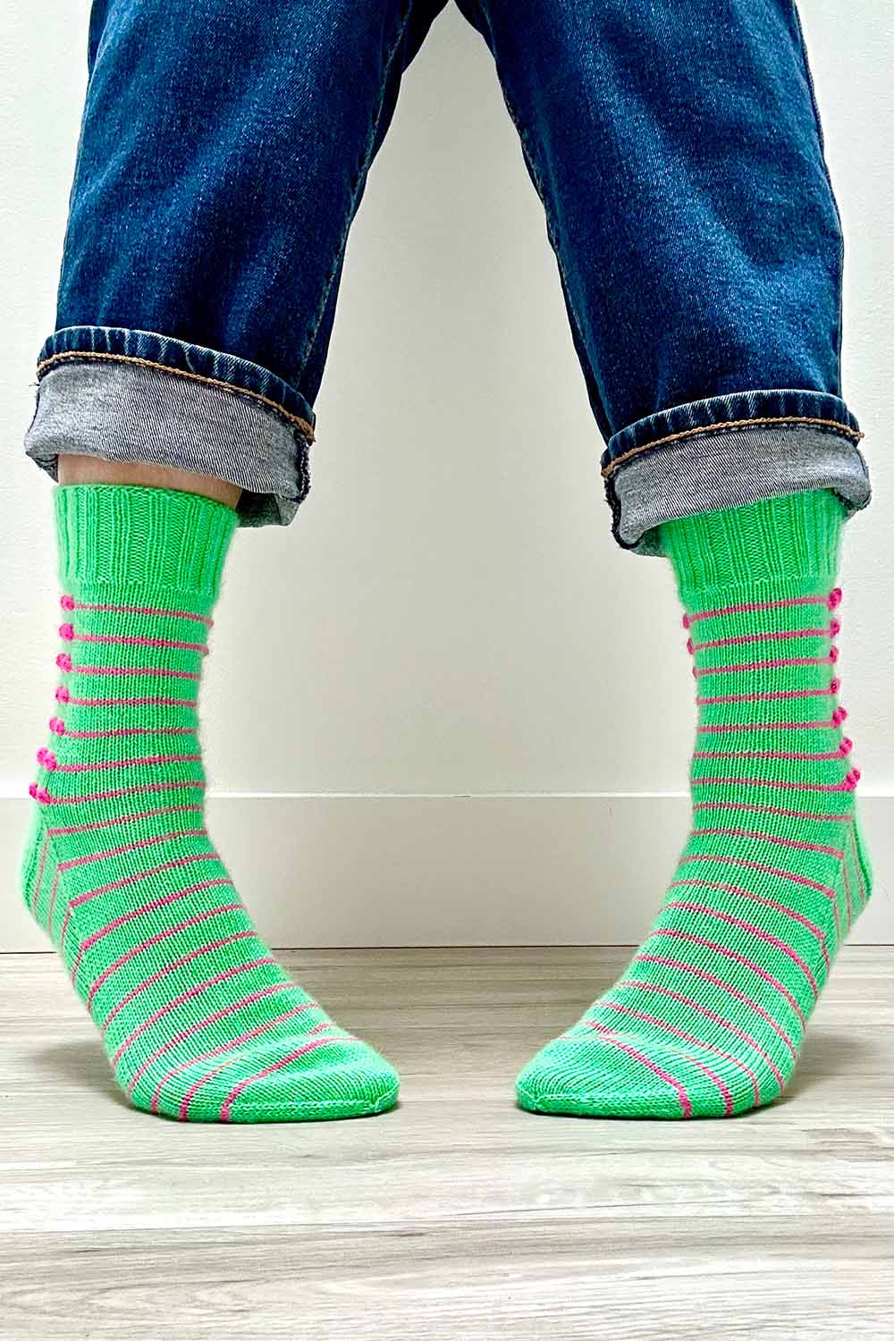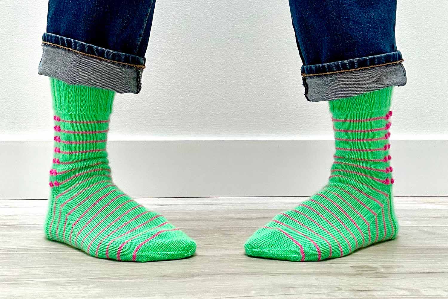 Fun socks are the best mood lifter. If bold stripes aren’t enough to sweeten your day, add two lines of compact bobbles running down to the ankle for a little extra fizz.