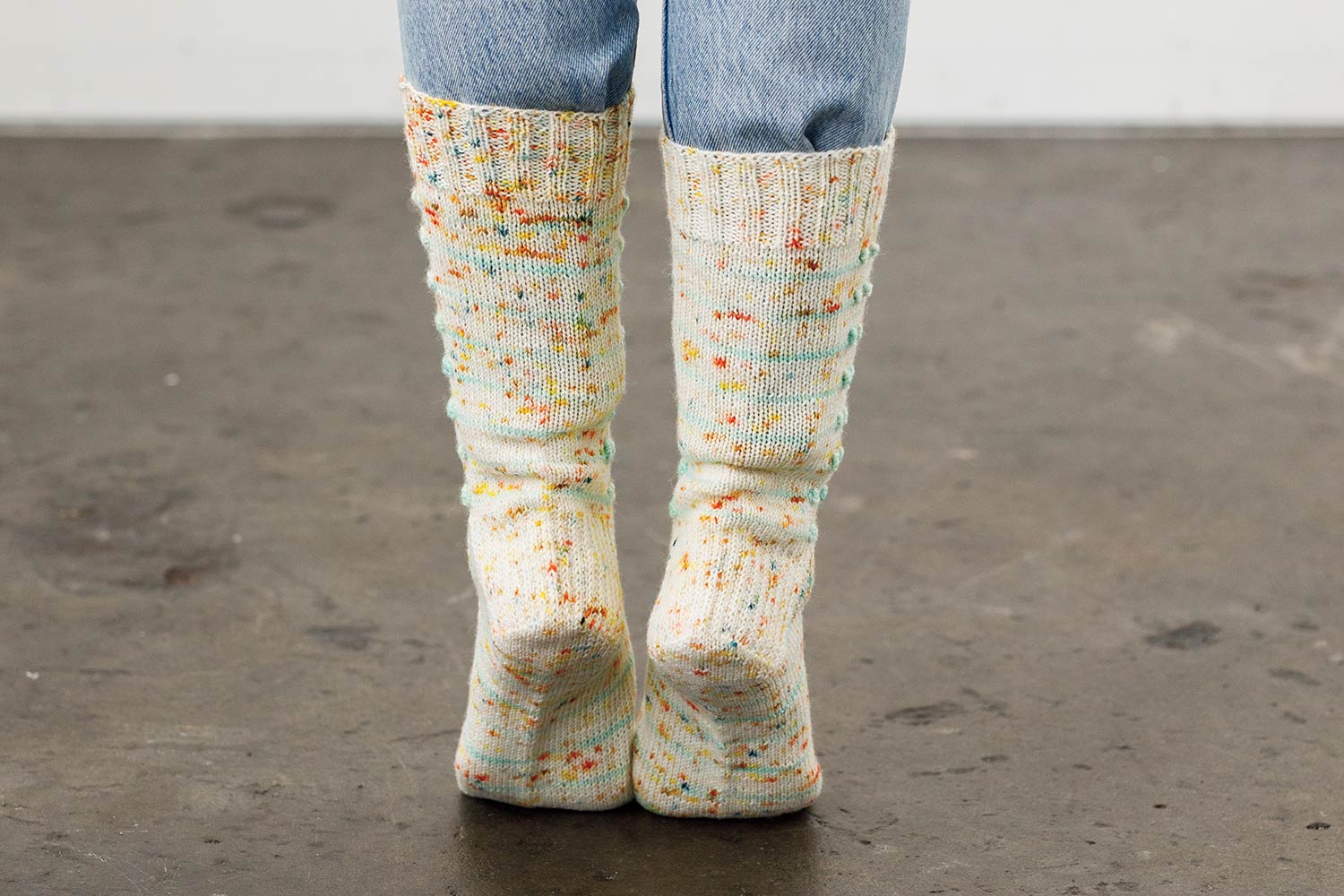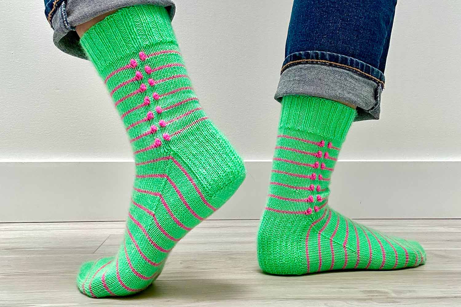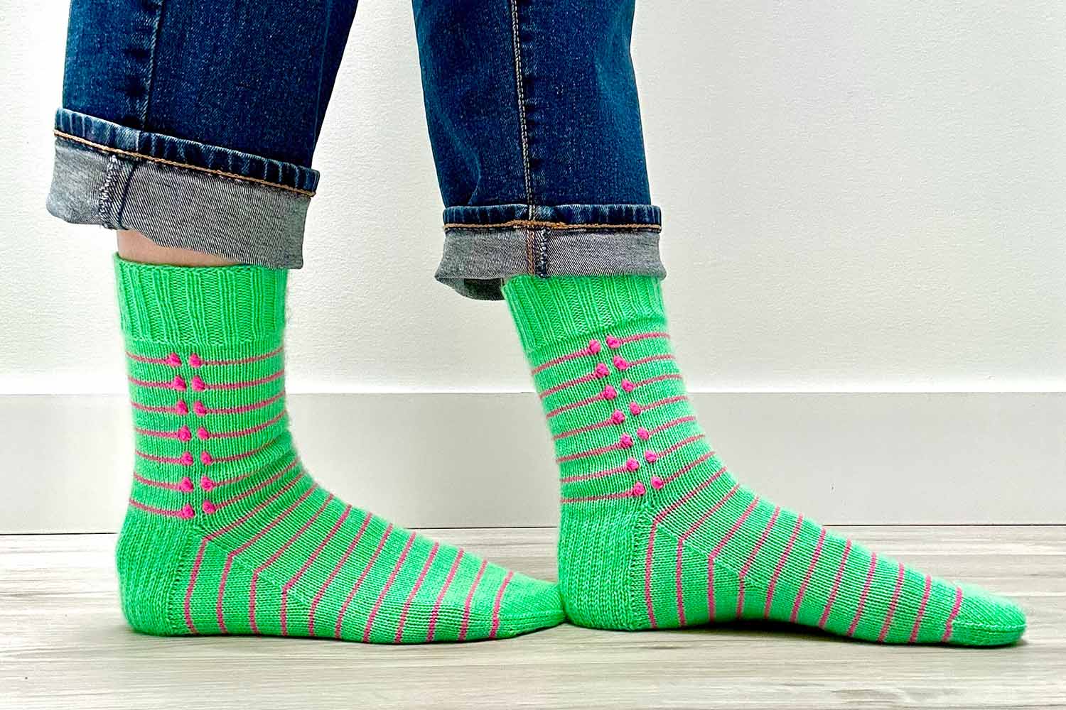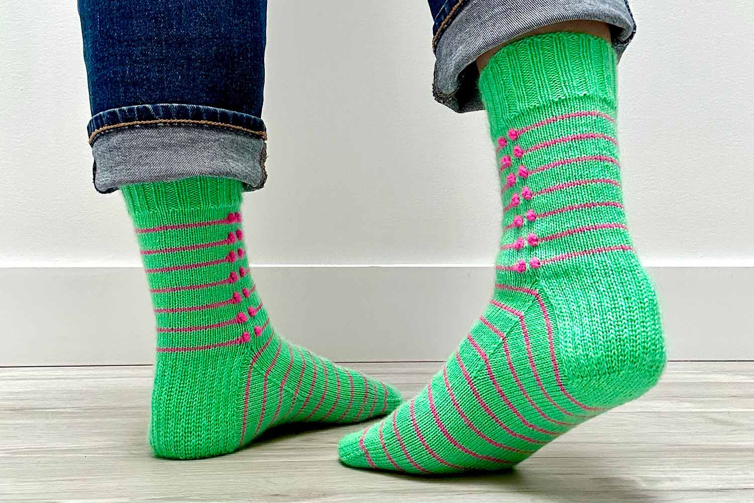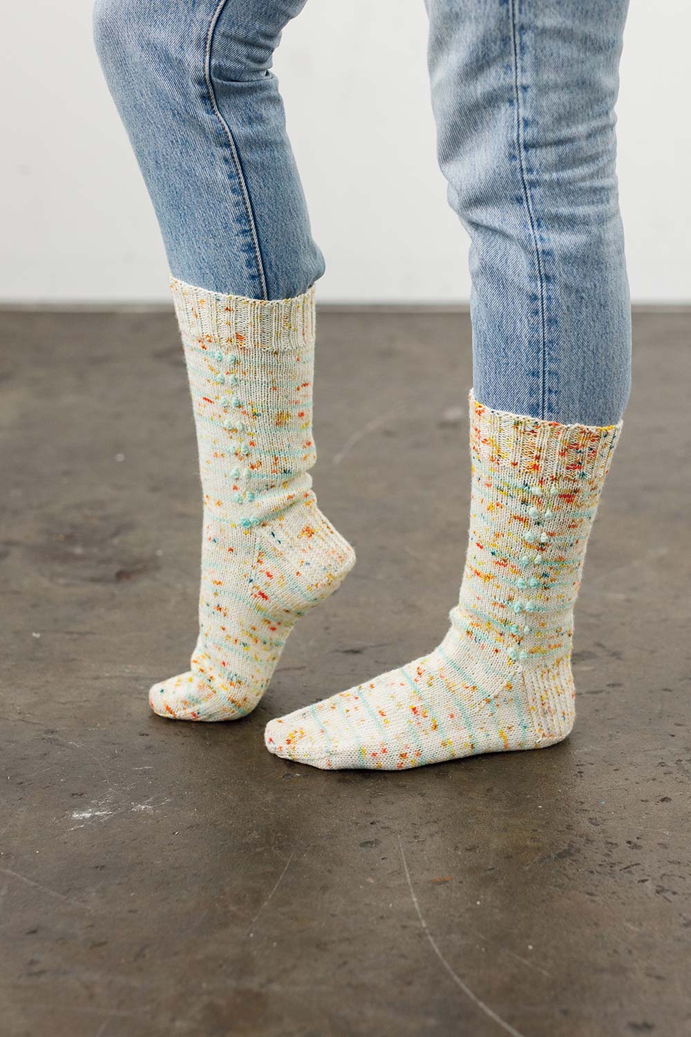 Fun socks are the best mood lifter. If bold stripes aren’t enough to sweeten your day, add two lines of compact bobbles running down to the ankle for a little extra fizz.