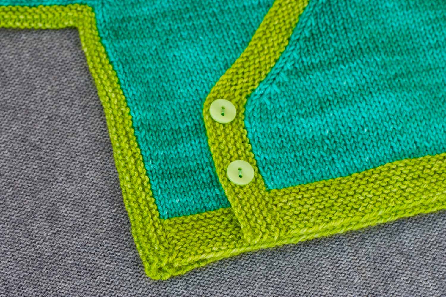 Flashes of colour pop in this cross-over style baby cardigan. With contrast-coloured garter stitch seams that are knitted-in rather than sewn, this sweater will be great fun to make and even more fun to wear.