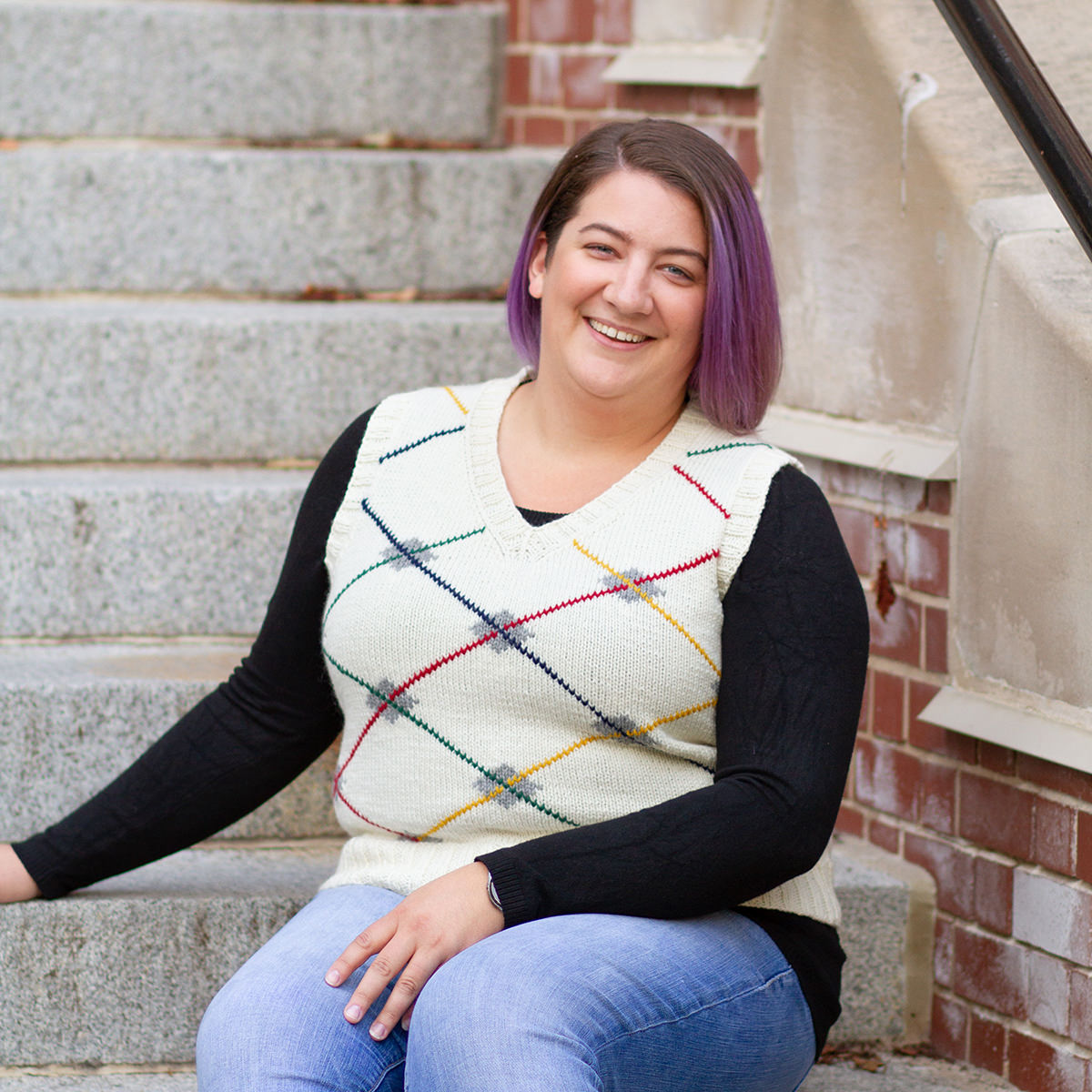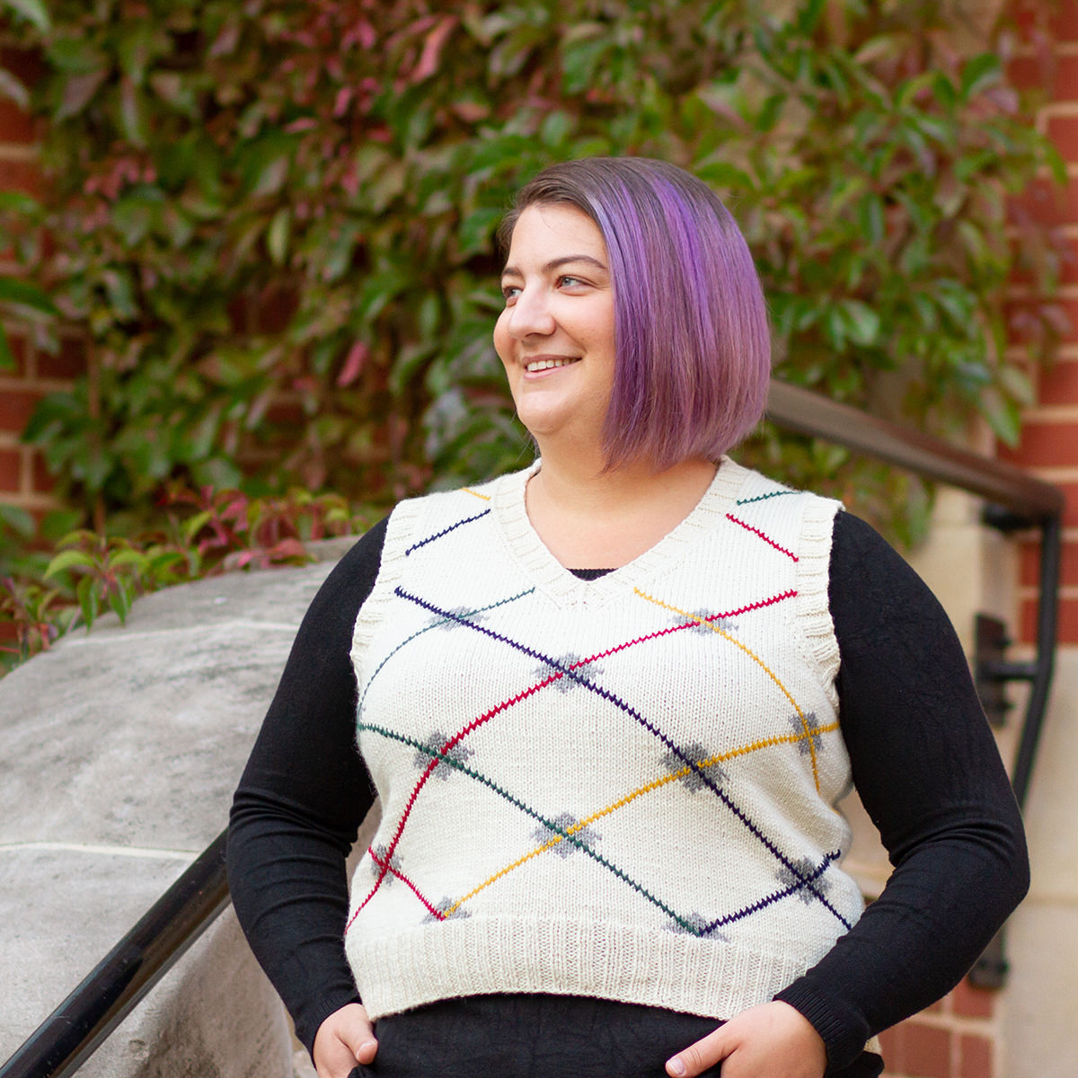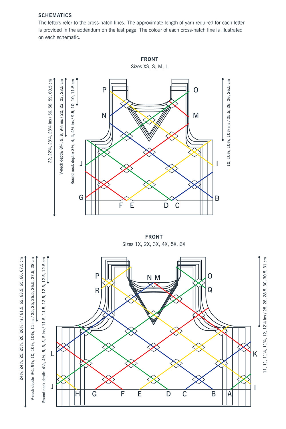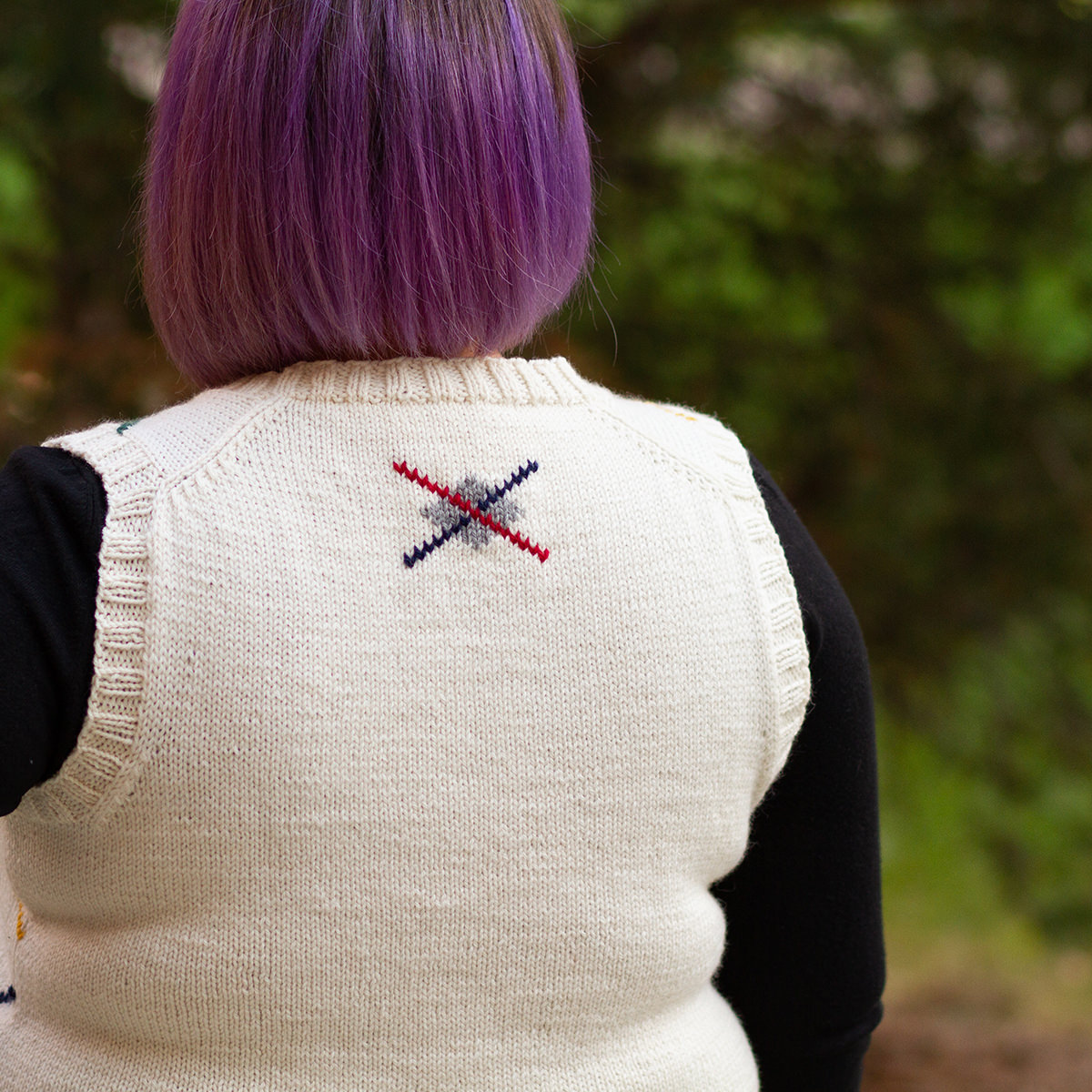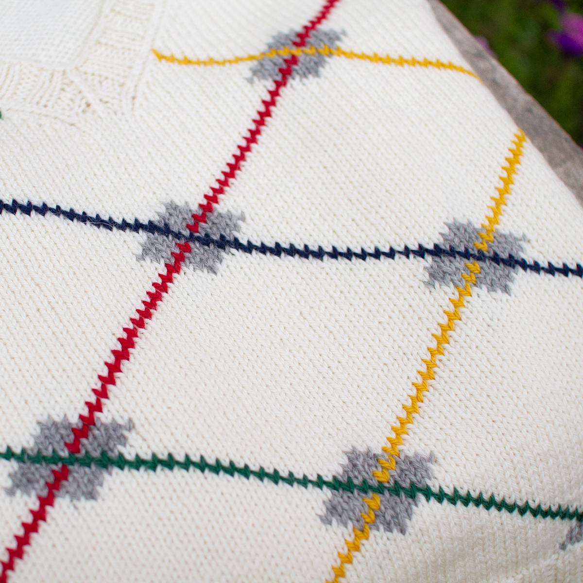 The vest is worked bottom up, in pieces and seamed. The argyle motifs and cross-hatching can be worked using the intarsia technique or added later with duplicate stitch. Stitches picked up around the armholes and neckline are worked in a ribbed edging.