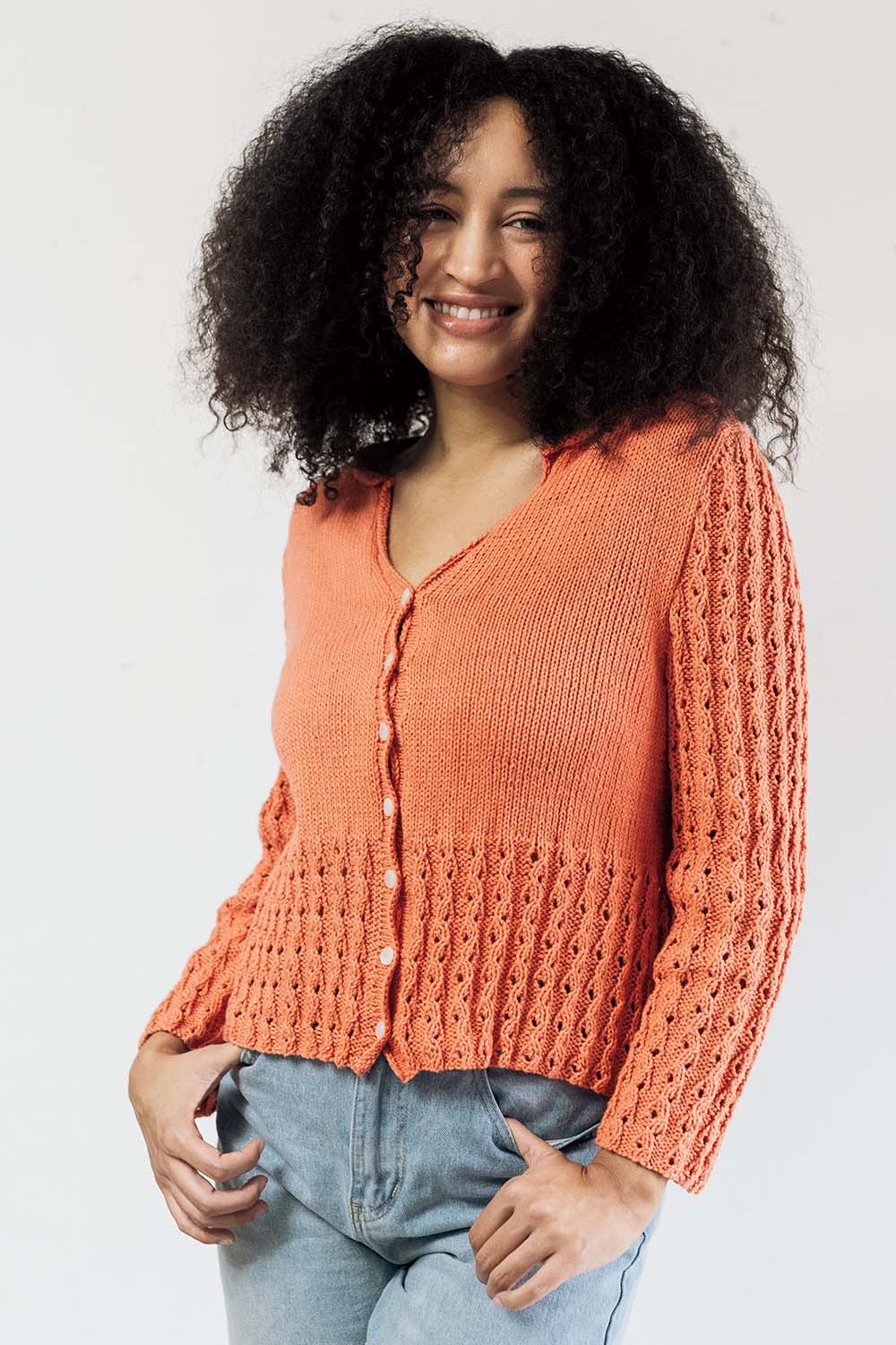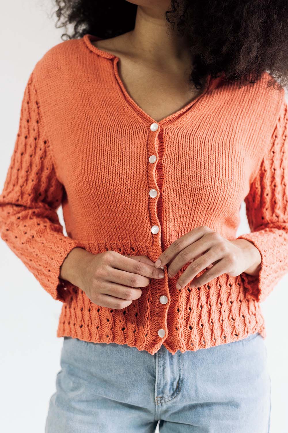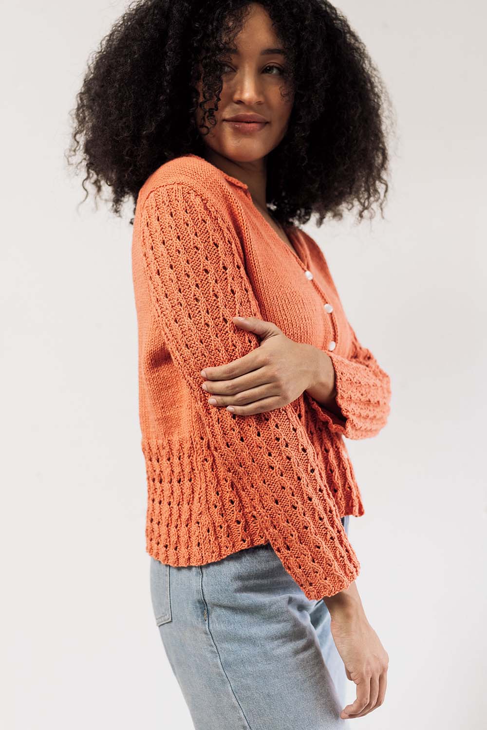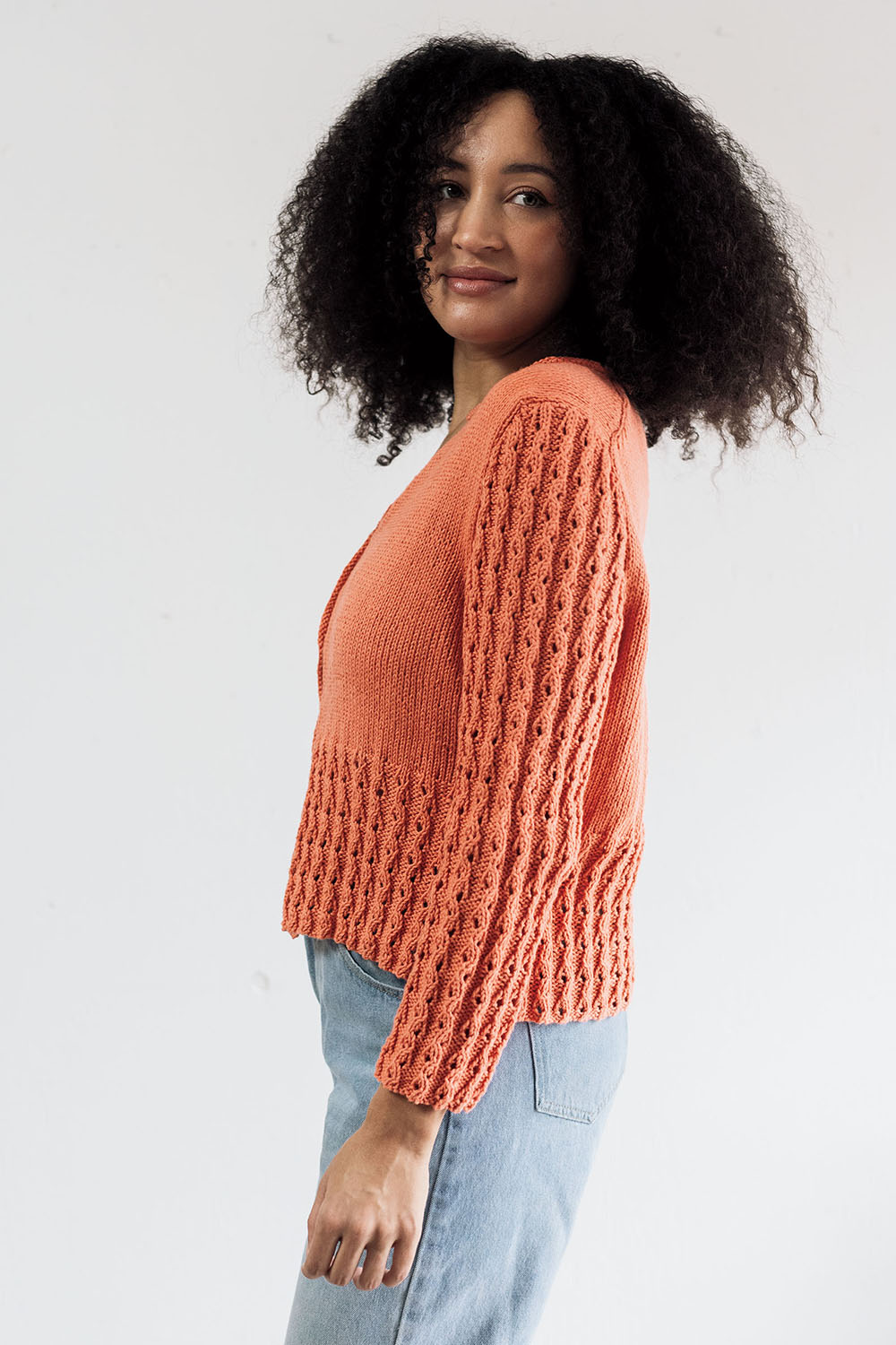 This cardigan is worked bottom up, in pieces, featuring a shaped waist, inset sleeves, and two options for sleeve length—short and three-quarter sleeves. English-tailored shoulders provide the perfect fit, with the front armhole deeper than the back and the shoulder seam angled over the upper back. The notched neckline is the insouciant finishing touch, combining the classic round neck with a flattering V to draw the eye up.