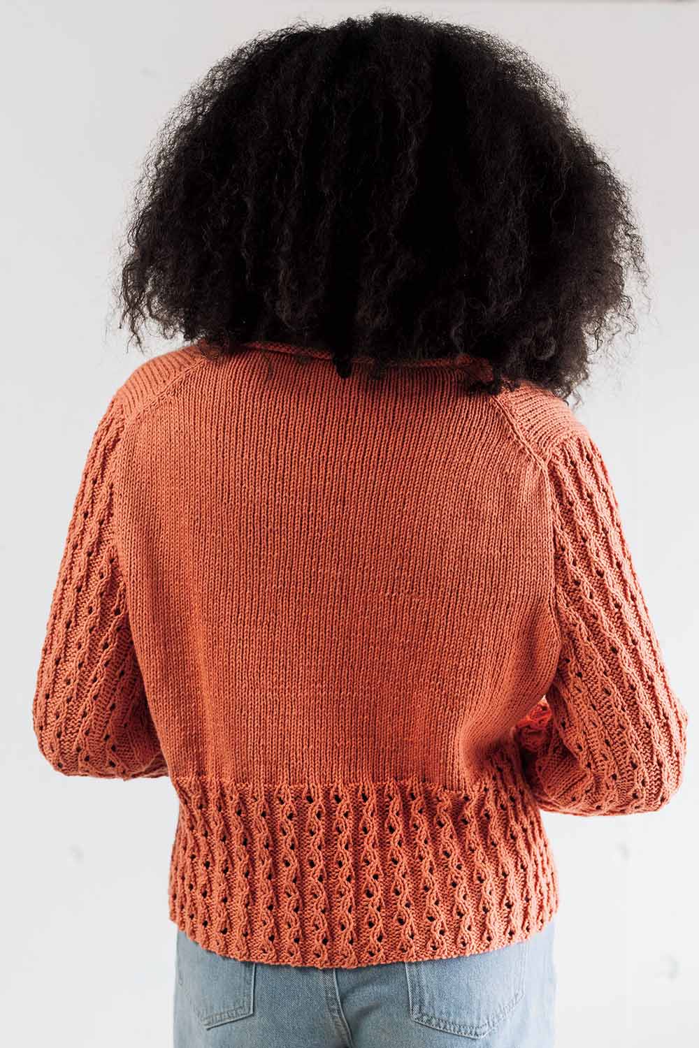 Increases/decreases, cabled decreases, yarnovers, working simple lace from chart or written instructions, basic sweater construction, English-tailored shoulders, seamed, bottom up, worked flat, picking up stitches, buttonholes, sewing on buttons.
