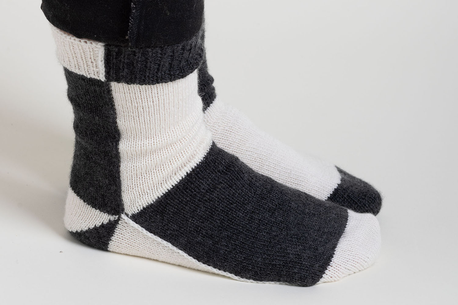 A striking sock made with bold colour blocks and worked completely flat on two needles. It’s cuff to toe and back again. The clever construction utilizes a “join as you go” modular technique along with a short-row heel and matching cast-on and bind-off methods.