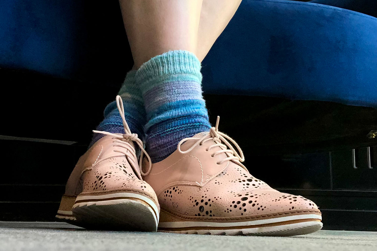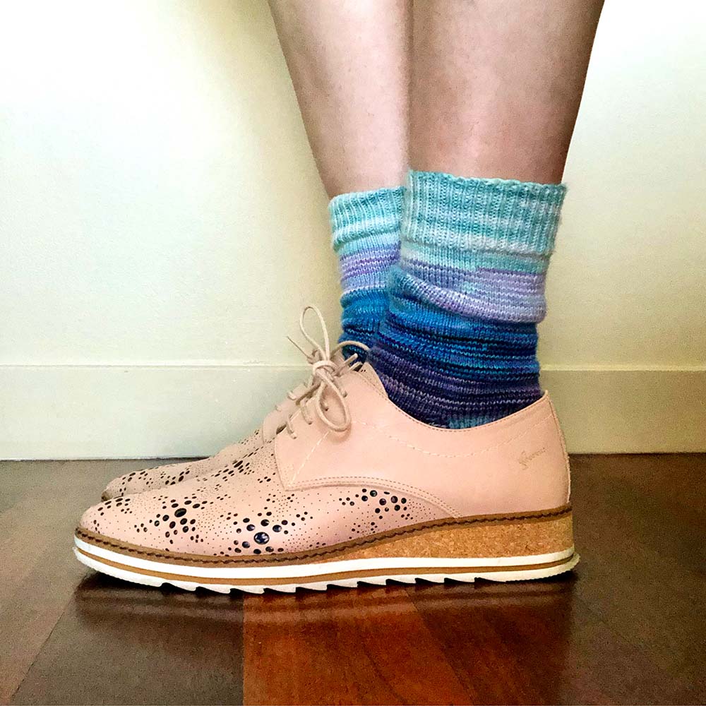 Choose two sets of five contrasting/coordinating colours and arrange one set from light to dark and the second set from dark to light. This can be a fun stash busting project using yarns from different brands, being sure they are all sock weight. Look for wool blends with some nylon, mohair or silk for strength and a tight twist and multiple plies for a sock that will last.