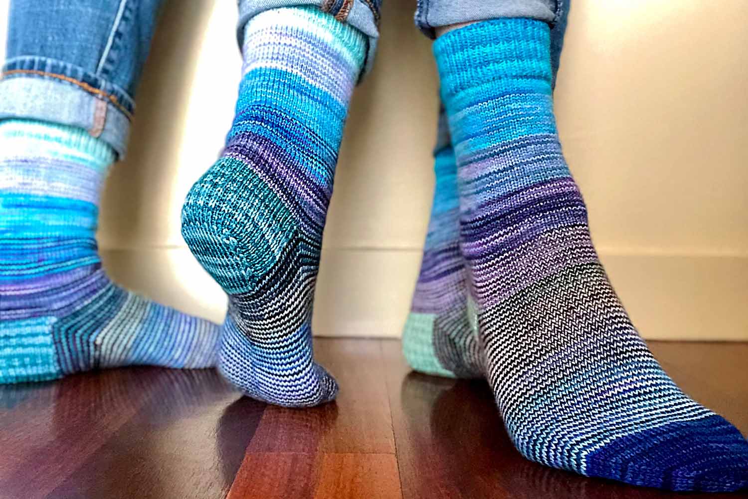 Striping two gradient sets against each other, lightening in opposite directions, makes for a very rewarding and cheerful knit. Shifting colors do all the work in these dazzling but simple socks—no fancy footwork required.