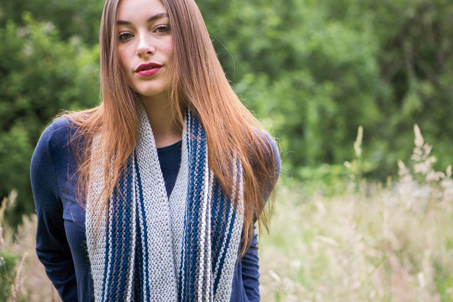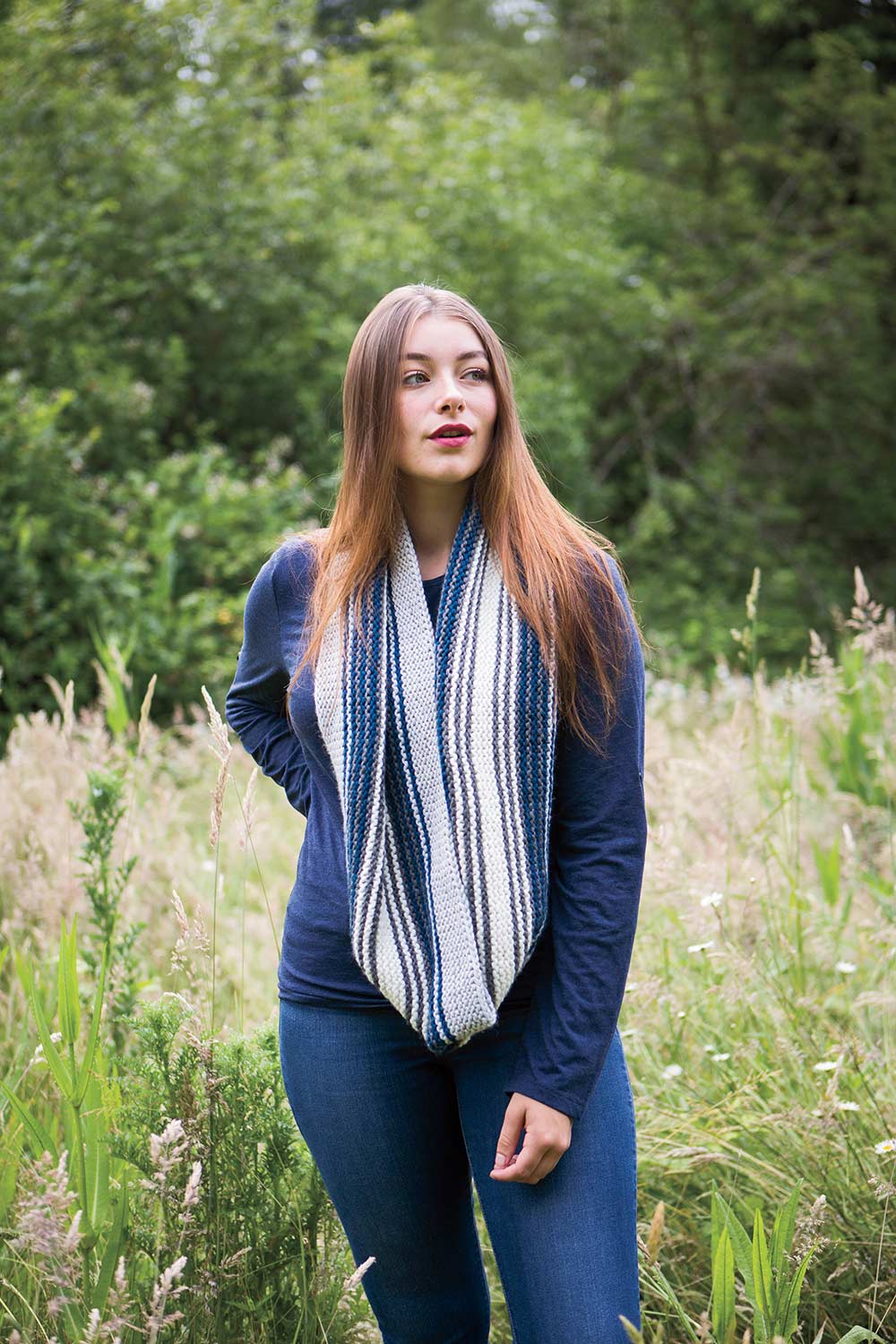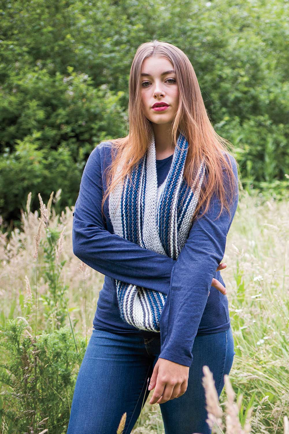 Generous length, rhythmic stripes and soothing garter stitch add up to a cowl that’s relaxing to knit and cozy to wear – the ultimate comfort knit. Choose high contrast colours for impact, or toning shades for an even more soothing effect.