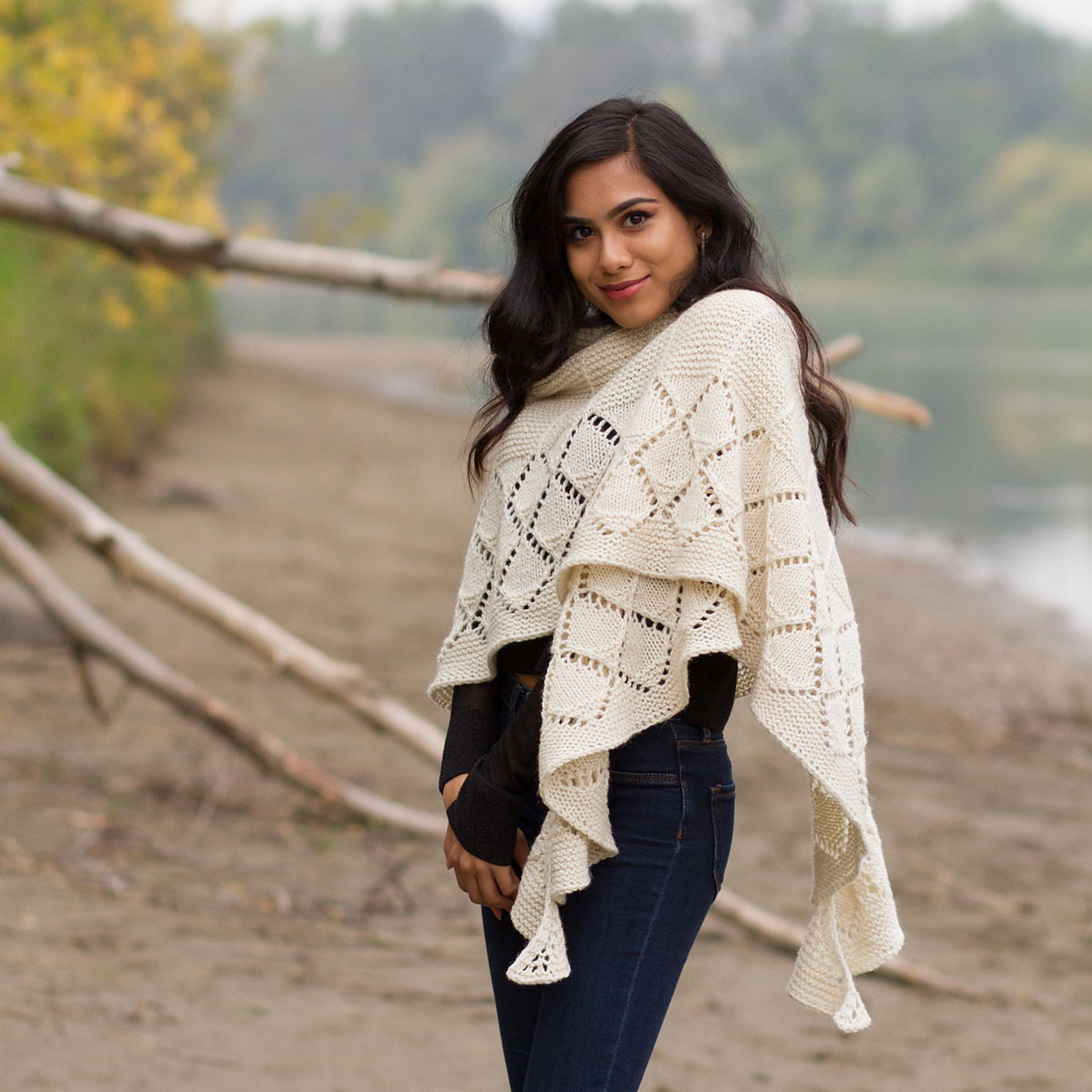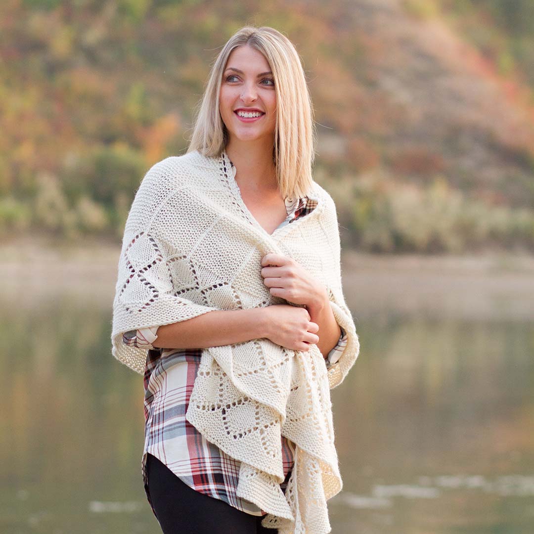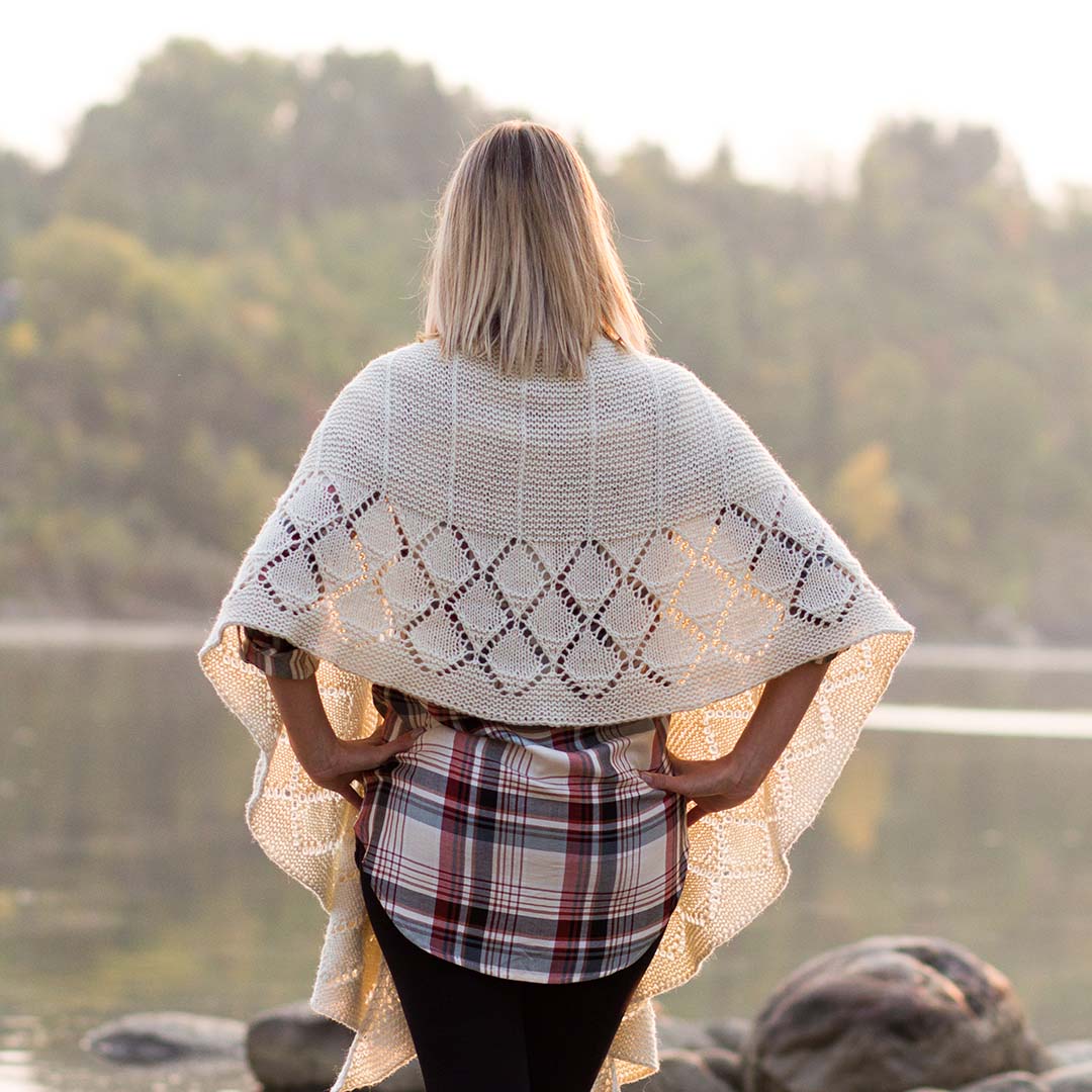 Wrap yourself in this beautiful shawl and head out to gaze at the night skies. Perfect for cool evenings in any season and made all the more scrumptious with a cup of hot cocoa in front of the fire, indoors or out. Made from cozy worsted weight yarn, this shawl can be knit up quickly: in less time than it takes the moon to go from waxing to first quarter!