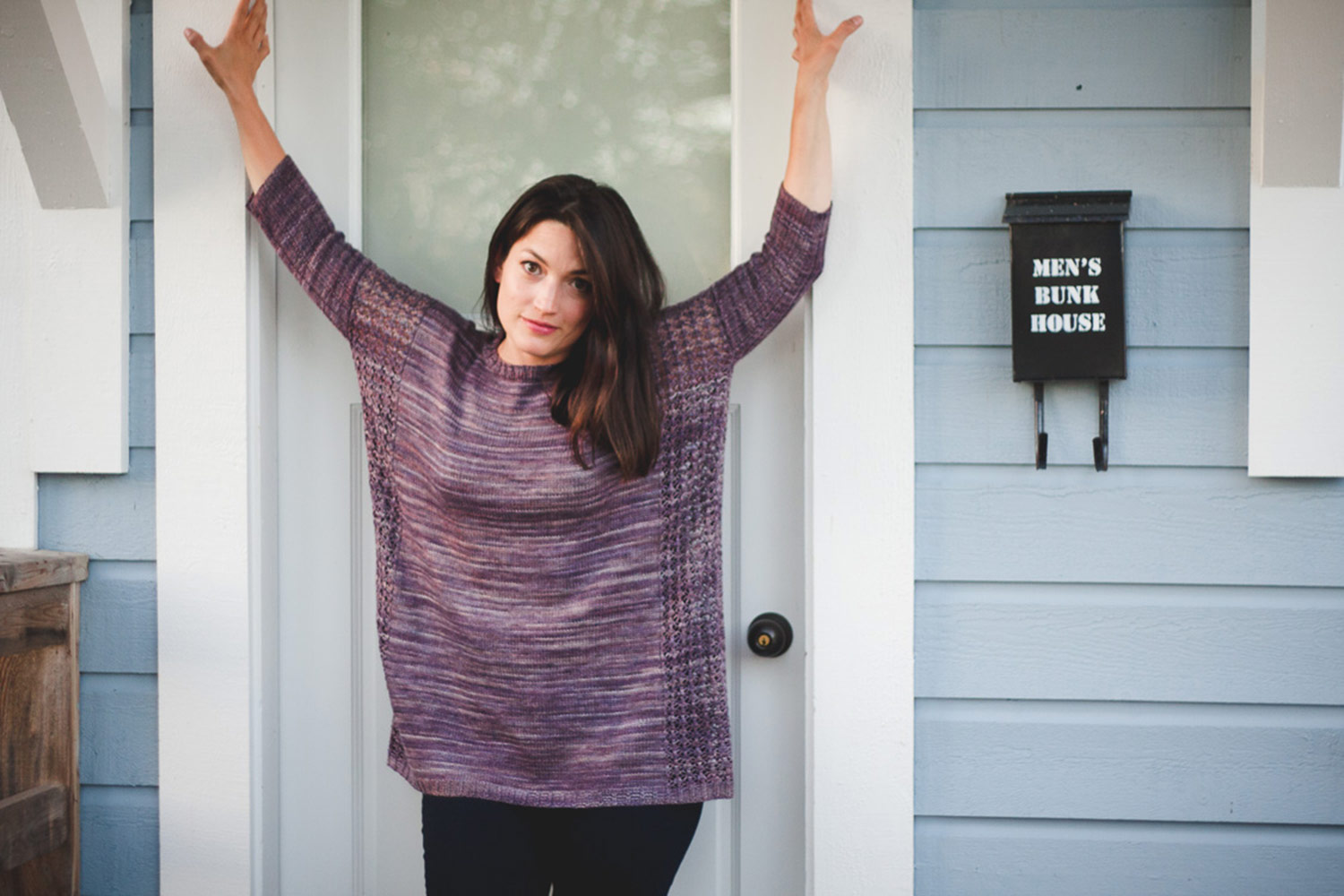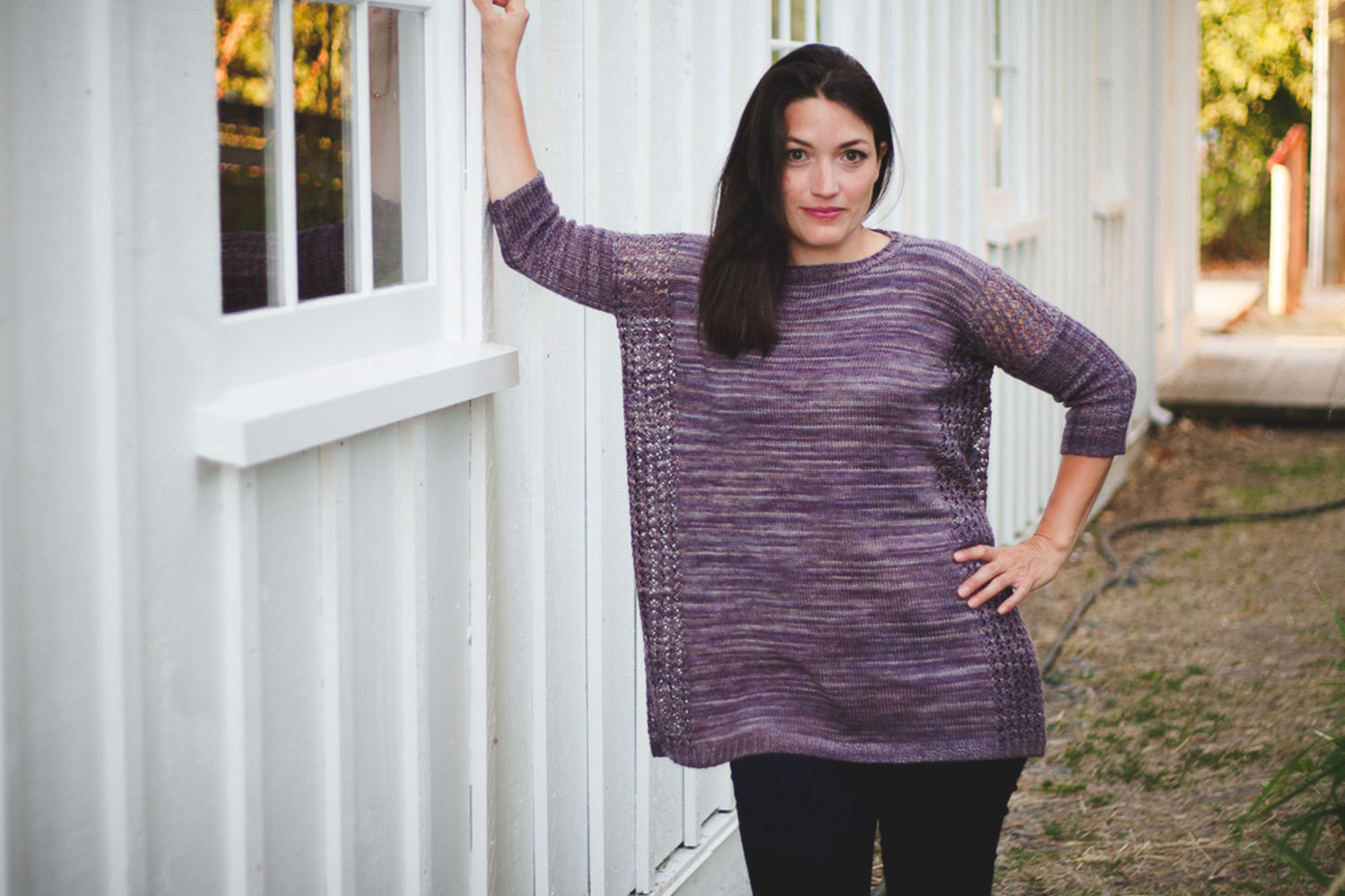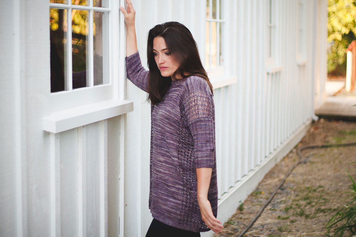 Drop shoulder construction is taken to the extreme in this oversized, flowing pullover. Skinny three-quarter length sleeves give a contemporary look. Vertical bands of lace at each edge of the front and back add lightness and interest to the garment as well as a long and lean look to the wearer.