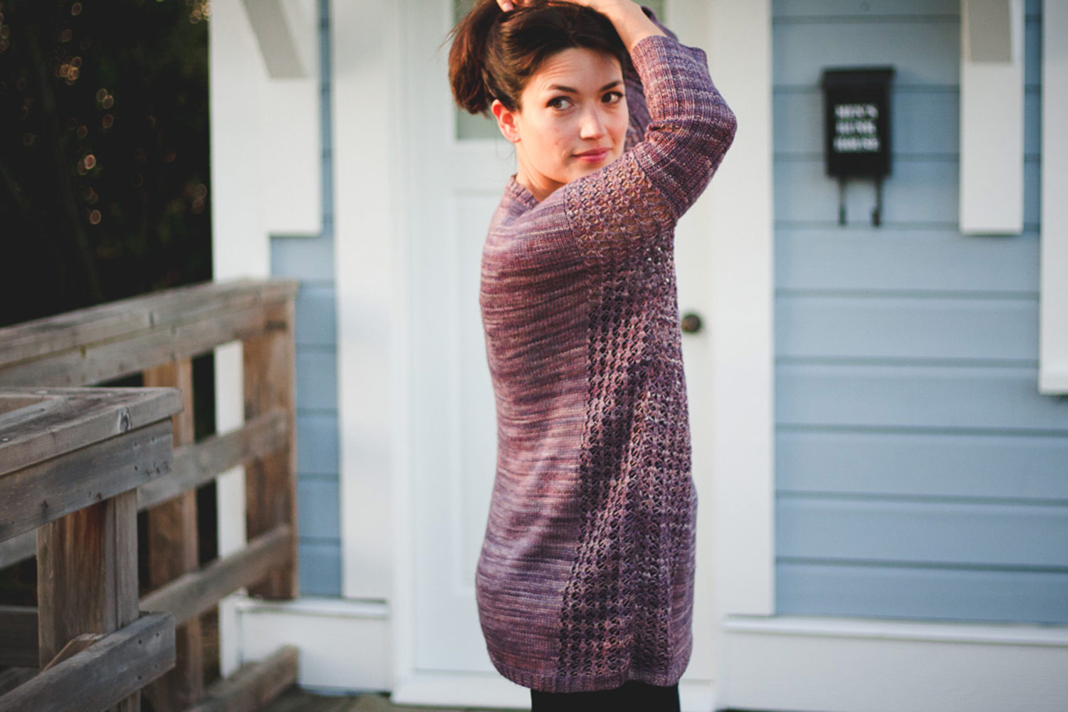 Increases/decreases, three needle bind off, working lace from a chart or written instructions, basic drop shoulder sweater construction, worked flat, bottom up, seamed, picking up stitches.