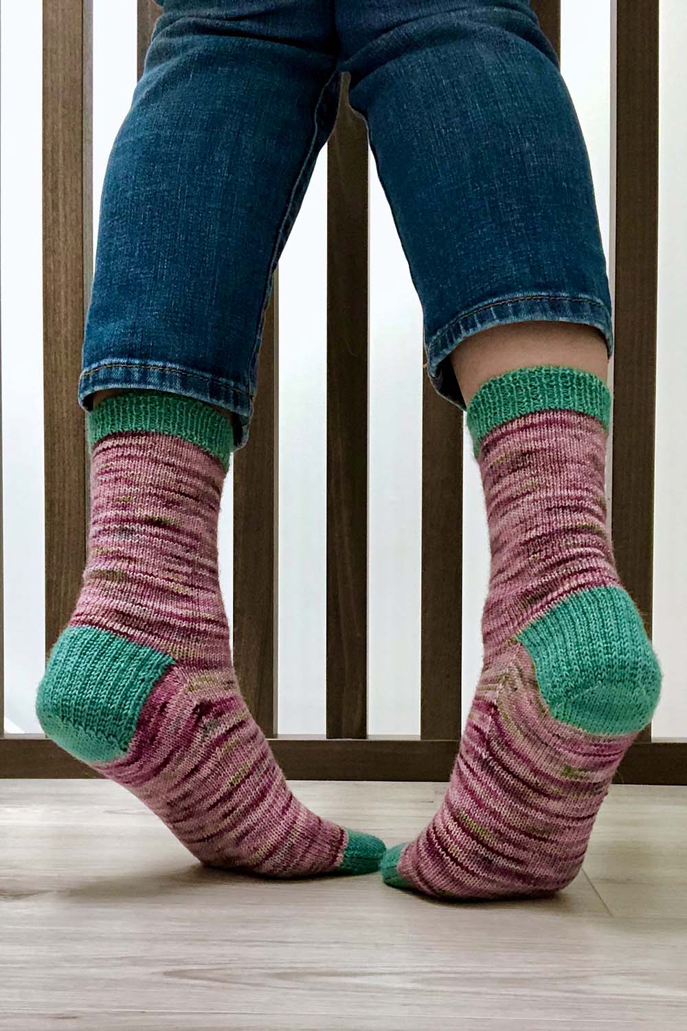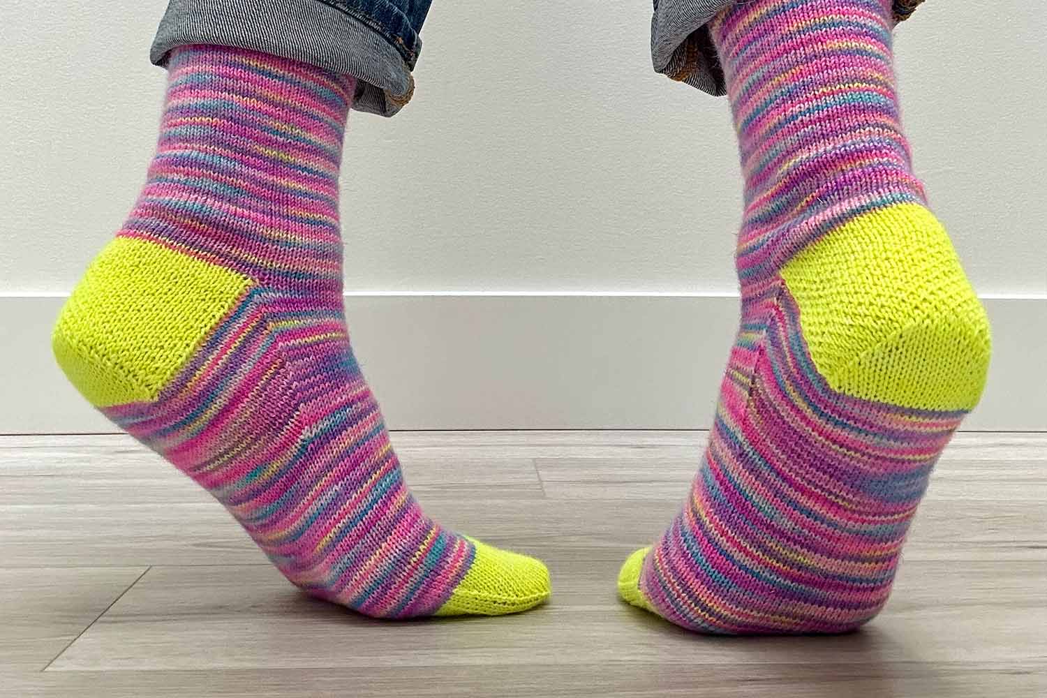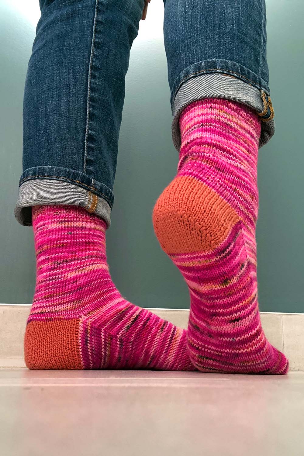 The generous yardage specified is for a 9 ½” (24 cm) foot (shoe size US Women’s 9/Men’s 8, UK 7.5, EUR 41). Optional contrasting-coloured heels, toes, and cuffs require about 20-25% of the total sock yardage.