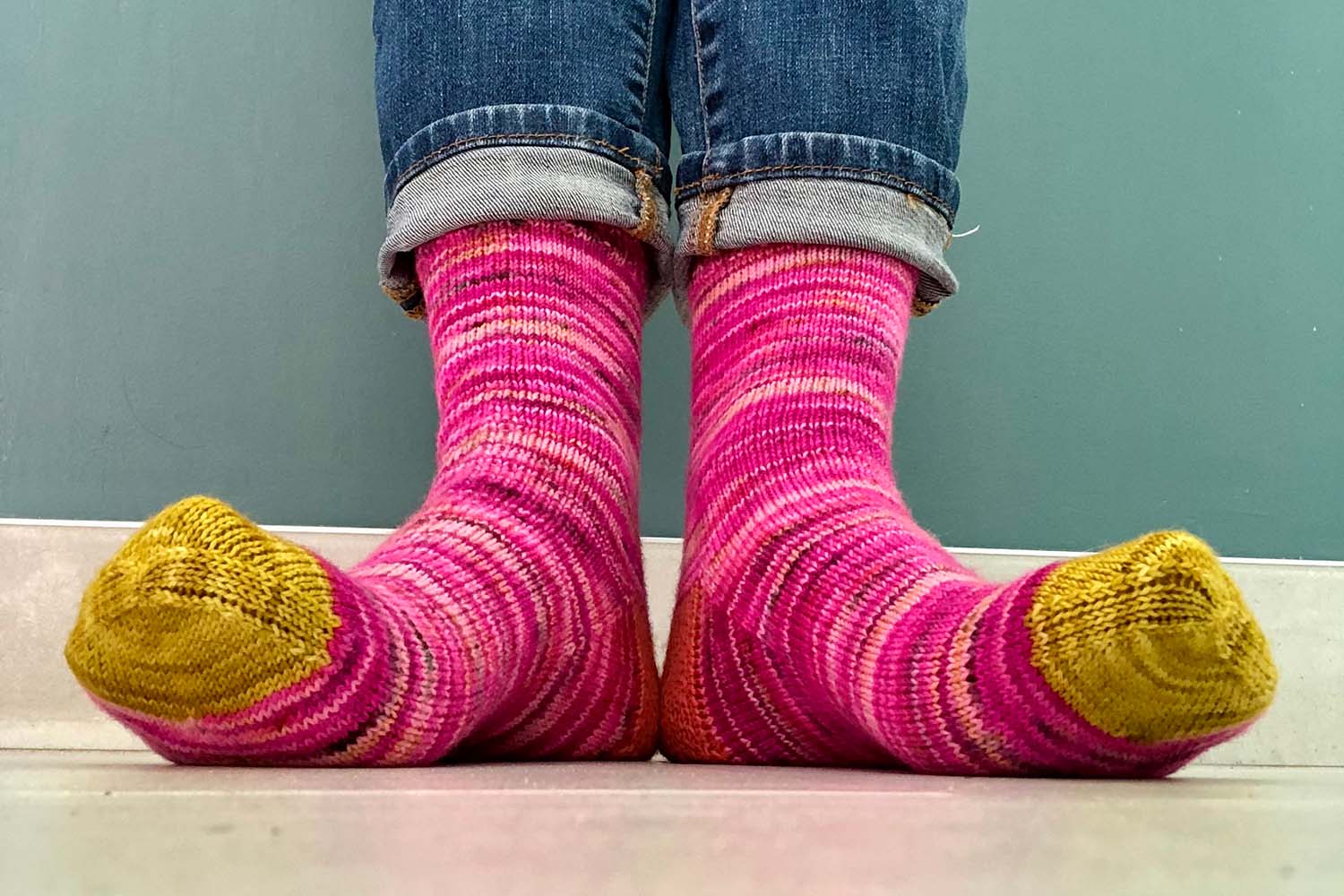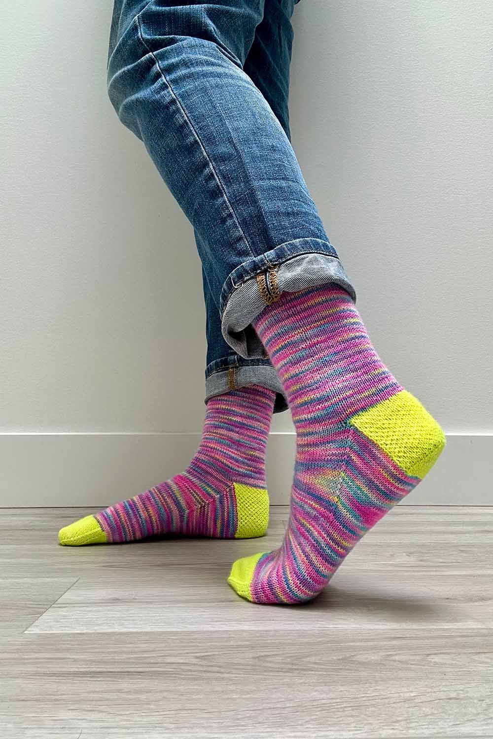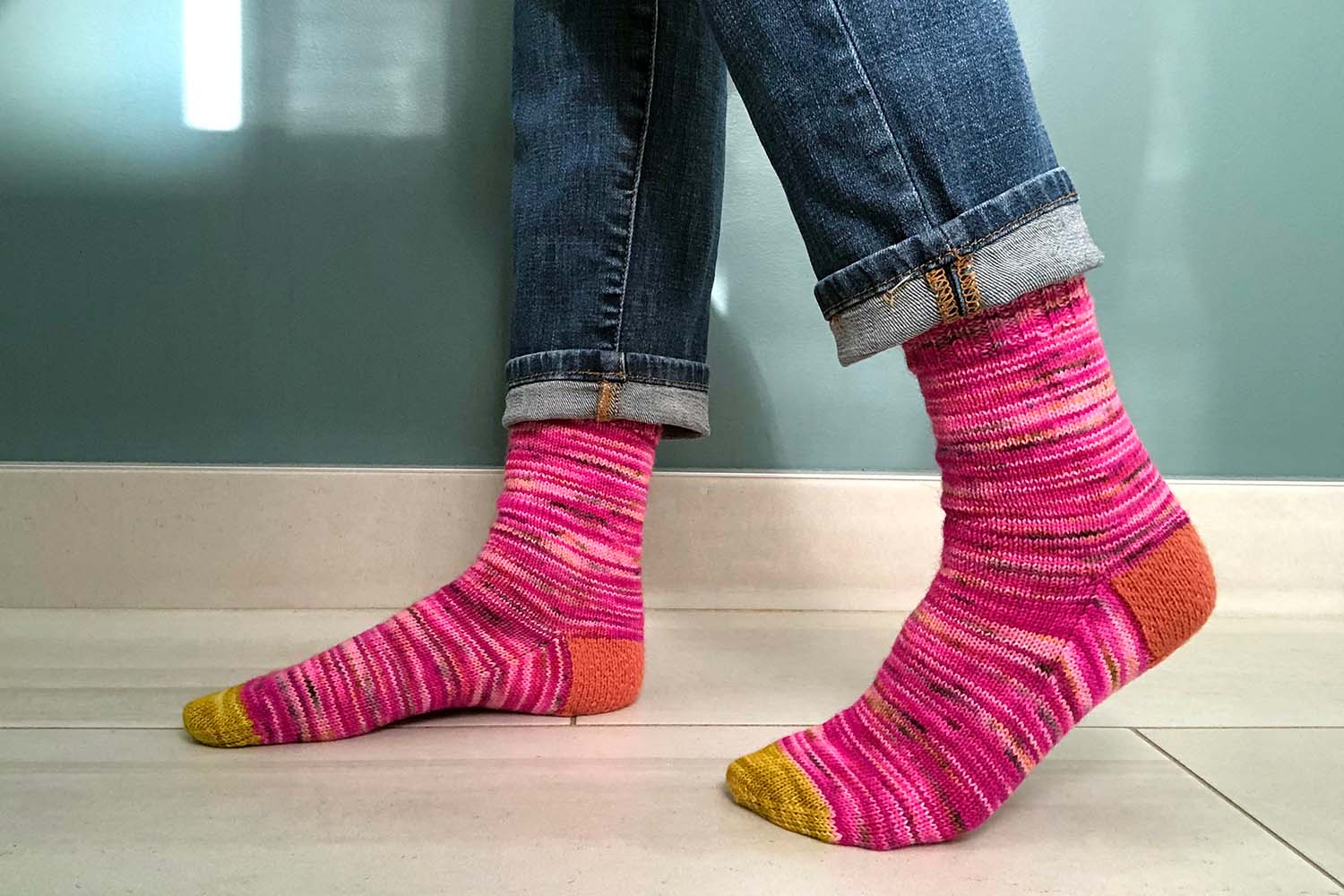The generous yardage specified is for a 9 ½” (24 cm) foot (shoe size US Women’s 9/Men’s 8, UK 7.5, EUR 41). Optional contrasting-coloured heels, toes, and cuffs require about 20-25% of the total sock yardage.