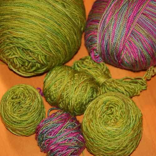 I was all set to block some of the pieces and I was really happy with the combination of hand-painted and semi-solid colourways. I wanted to double-check something against one of my finished samples only to realise that I’ve been knitting the wrong size. Aargh! Here’s the result.