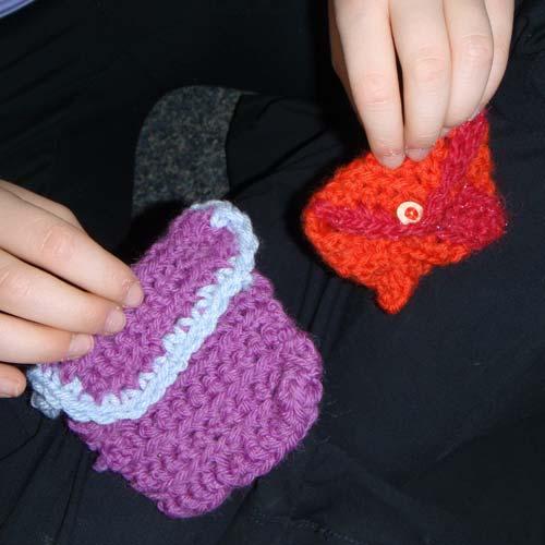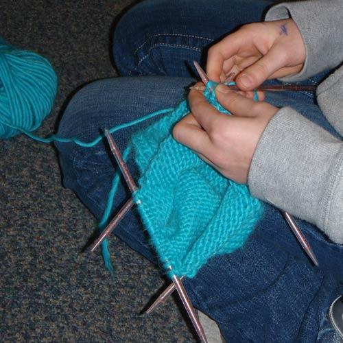 My knitting kids made a small backpack knit in the round. They did a fabulous job and the double-pointed needles barely fazed them!