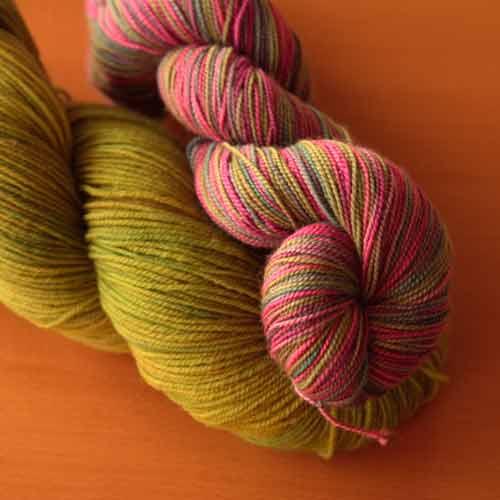 The variegated is Cherry Tree Hill Supersock in Old Rose colourway and it’s paired with Dream in Color’s Smooshy in Spring Tickle. I’m knitting Peacock and I’m looking forward to the finished product.